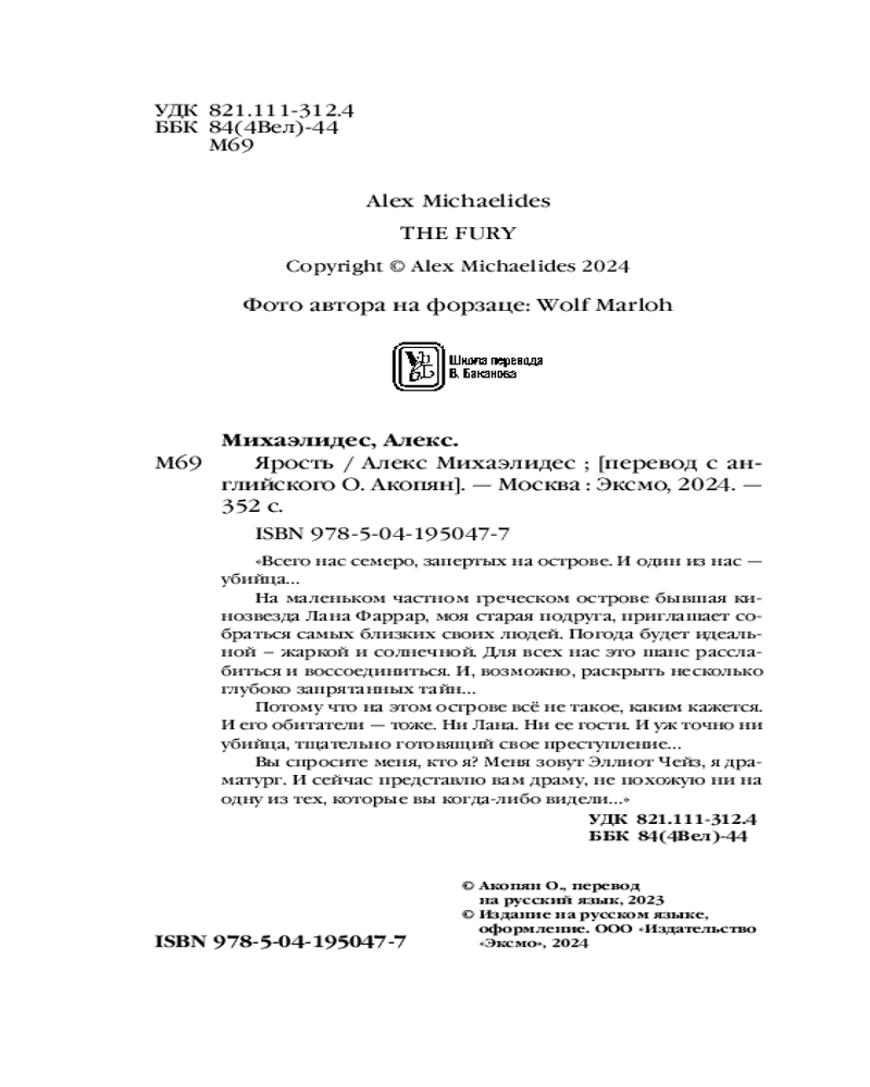 Кто знаком с работами Алекса Михаэлидеса заценят. Каждое его книга не похоже на предыдущий. Каждый раз использует разные стили, есть только одно общее, там есть одна строчка посвященная герою первой книги «Безмолвный пациент » Тео😍 всем советую кому интересна психология и захватывающий сюжет