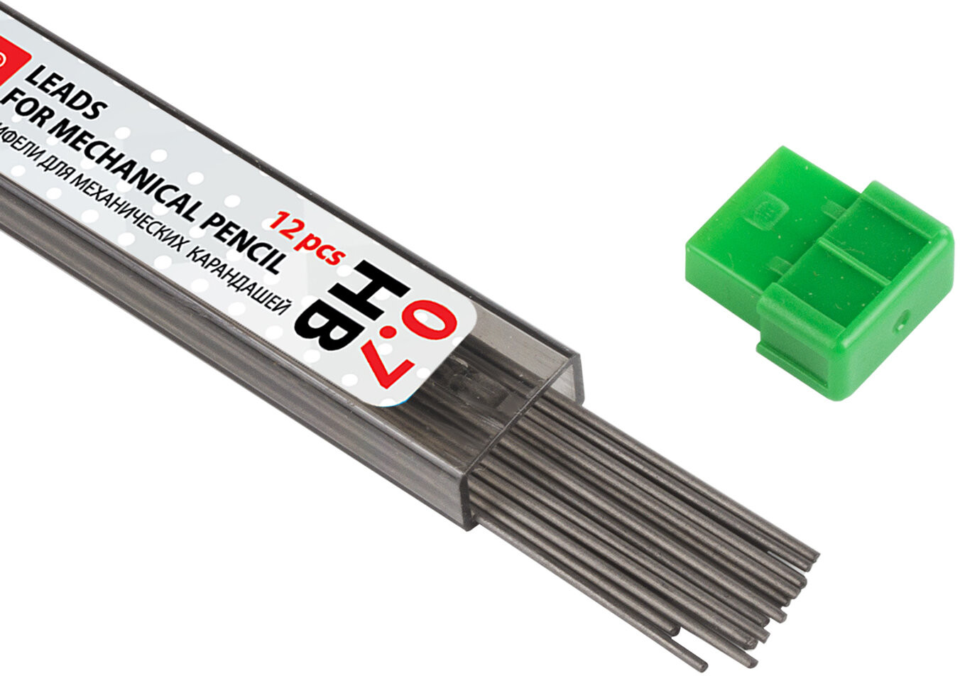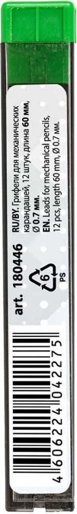 Изготовлены из высококачественных полимерных материалов, обеспечивающих мягкое письмо. Устойчивы к излому. Обладают средней степенью твердости — HB. Длина грифеля составляет 60 мм, а его диаметр — 0,7 мм. 12 штук в упаковке. Поставляются в пластиковом пенале.