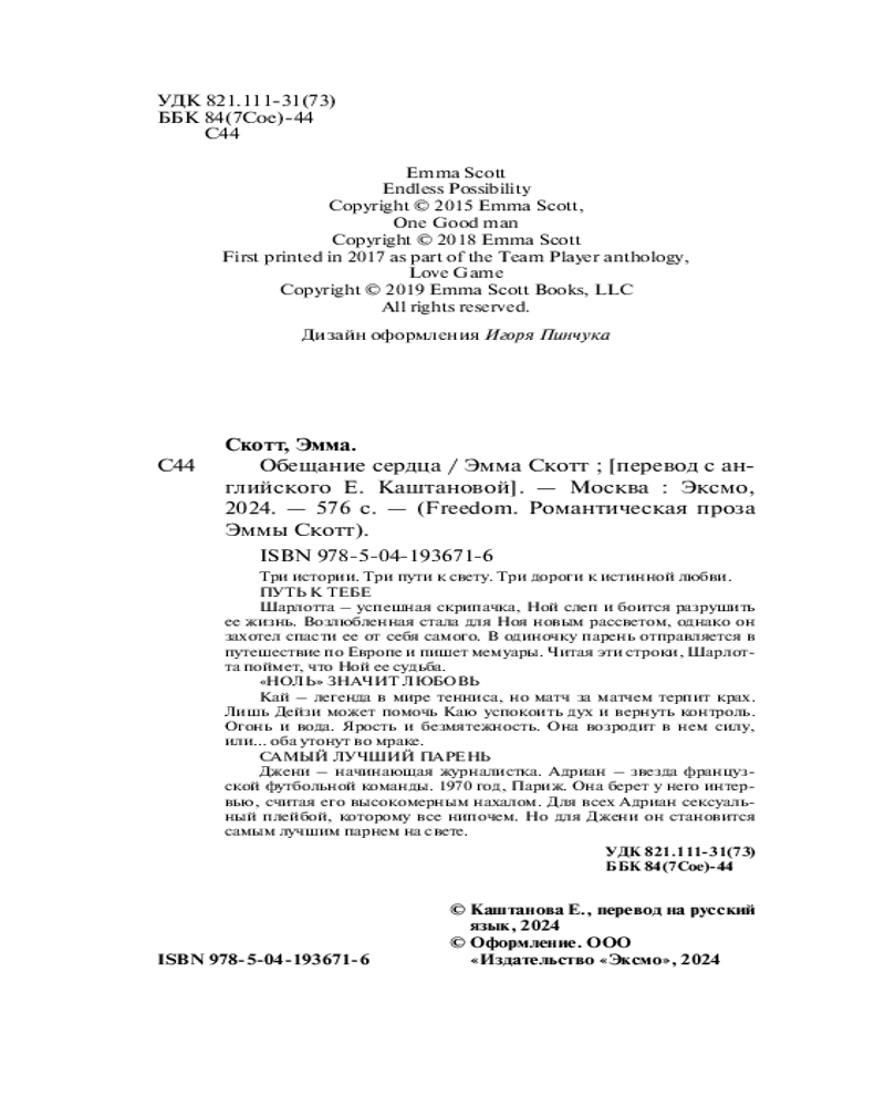 💳 Оплатить за товар можно при получении 🇰🇿 Есть бесплатная доставка по Казахстану 🎁 Копите бонусы с каждой покупки Серия: Freedom. Романтическая проза Эммы Скотт Три романа под одной обложкой — от автора, покорившего читательские сердца, — Эммы Скотт! Истории любви, которые взбудоражат вашу душу и всколыхнут потаенные чувства. Freedom продолжает издавать неизданные романы писательницы, ведь уже более полумиллиона читателей по всей России являются поклонниками ее творчества и ждут новые книги! |