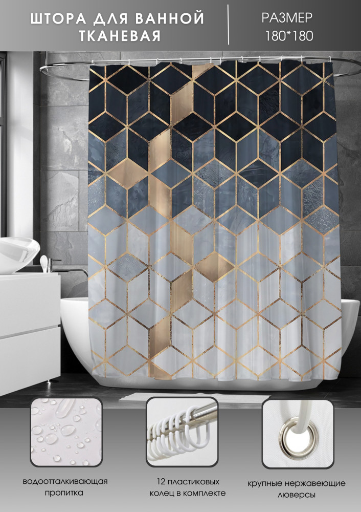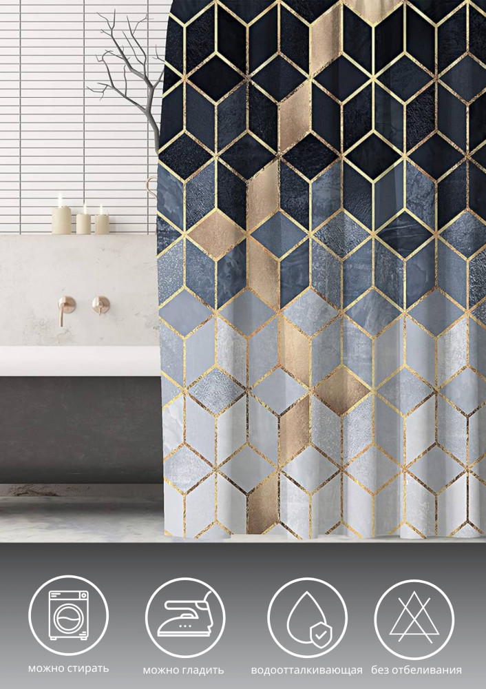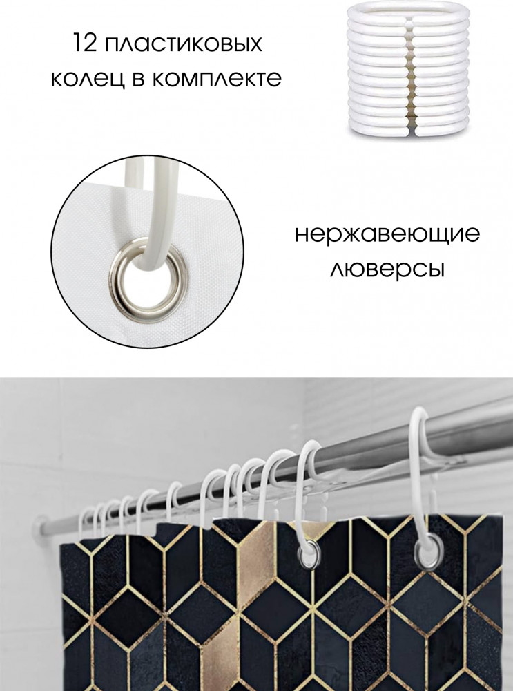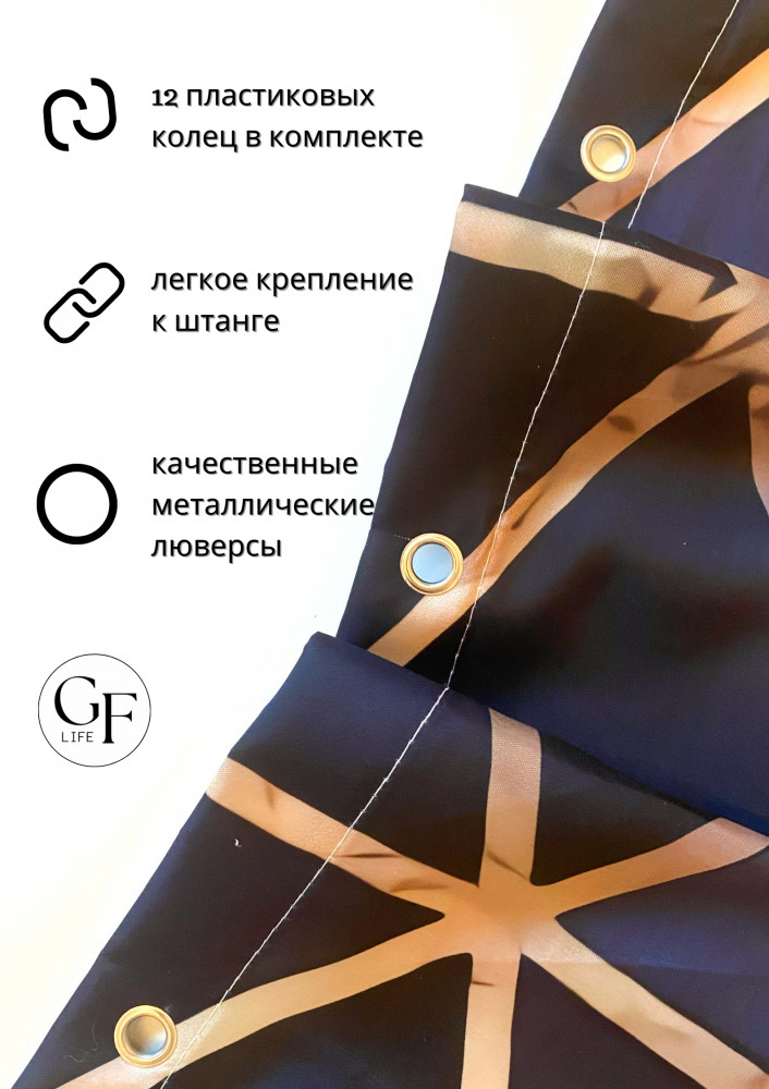 Тканевая штора для ванной комнаты выполнена из плотного полиэстера с водоотталкивающей пропиткой, устойчивого к загрязнению, влагостойкого, отличающегося долговечностью. Занавеска для душа — защита от брызг. Верхний край с металлическими люверсами. 12 пластиковых колец, которыми комплектуется занавеска для ванной комнаты, подходят ко всем современным карнизам.