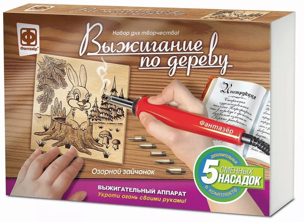💳 Оплатить за товар можно при получении 🇰🇿 Есть бесплатная доставка по Казахстану от 1 дня 🎁 Копите бонусы с каждой покупки Современный выжигательный аппарат со сменными насадками. Набор для творчества развивает мелкую моторику, пространственное мышление, воображение, творческие способности и внимание ребенка. С помощью прибора для выжигания можно создавать красивые, интересные рисунки на деревянной поверхности. В набор входят две фанерки: одна с нанесенным контуром рисунка (портрет волка на фоне холмов), а вторая — пустая — для самостоятельного нанесения рисунка. Достаточно нанести рисунок на поверхность, выбрать нужную насадку и начать выжигать. Используя различные насадки, наклоняя поверхность под различным углом, можно добиться того, что рисунок станет более объемным, а тонировка сделает картину выразительной, подчеркнет фактуру дерева. Готовую картинку можно раскрасить цветными карандашами, фломастерами или акриловыми красками. Покройте готовую работу лаком, он придаст работе законченный вид (лак в набор не входит). |