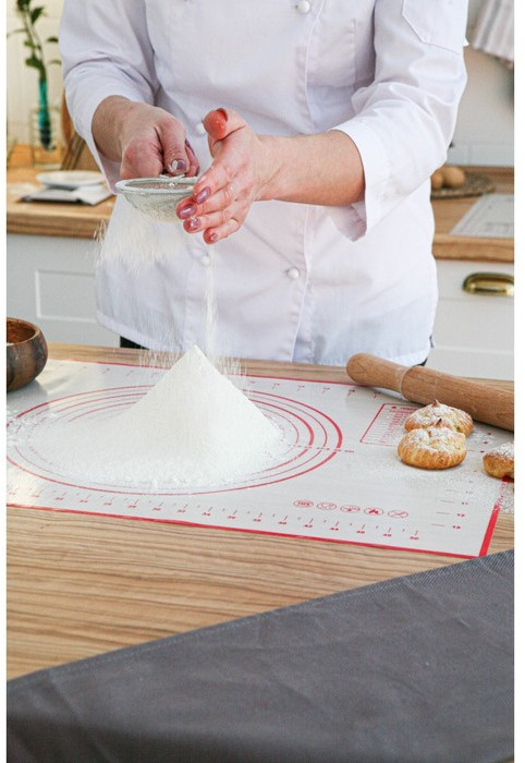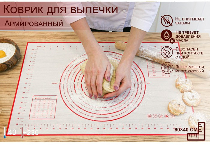 Коврик представляет собой стеклоткань, пропитанную пищевым силиконом. Приспособление отлично подходит для приготовления любимой выпечки. Выложите тесто на коврик, раскатайте и поставьте в духовку вместе с изделием.