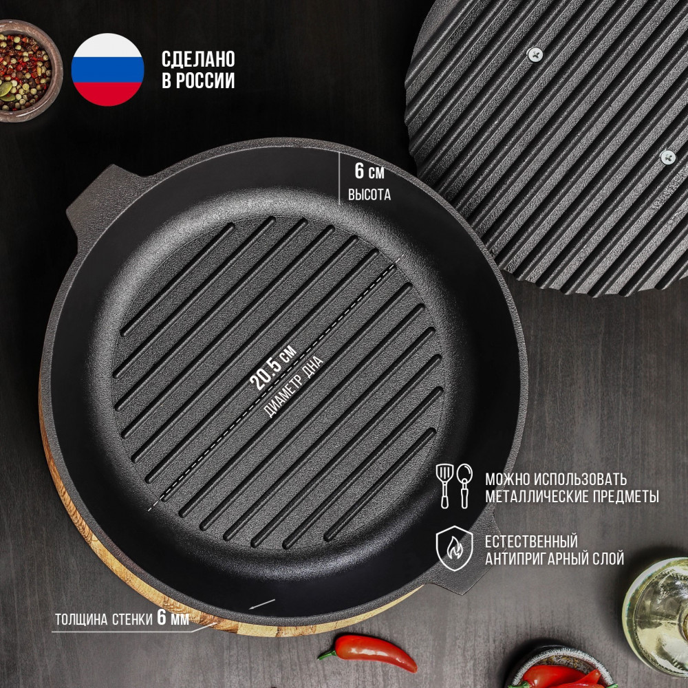Сковорода-гриль c чугунной крышкой Magma изготовлена из высококачественного чугуна, что придает ей повышенную долговечность и износостойкость. Вместе с тем, утолщенное дно до 6 мм обеспечивает отличную теплопроводность и эргономичность использования. Вы сможете приготовить свои любимые блюда без особых усилий и с минимальным количеством масла и соли. Природное антипригарное покрытие делает сковороду еще более удобной в использовании.