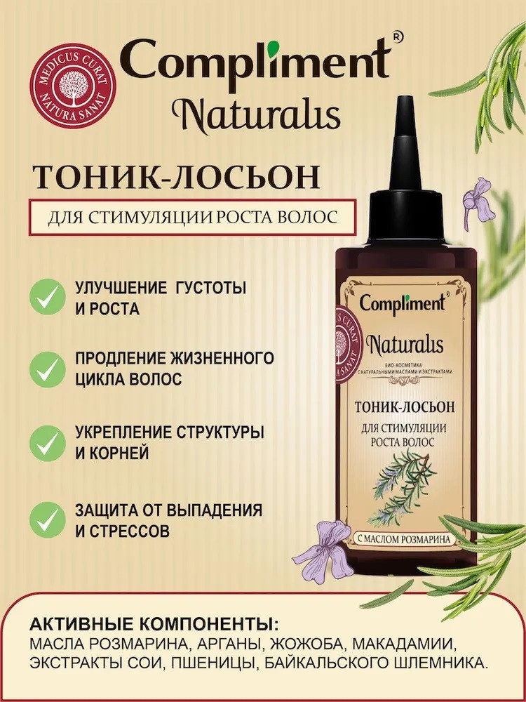 Compliment Тоник-лосьон для стимуляции роста волосне жирнит холодок мята легко наносится не склеивает В данный момент этот товар отсутствует в продаже. Возможно, у нас найдется аналогичный или похожий товар здесь. Серия: Naturalis Формула на основе природных масел и растительных экстрактов для интенсивной профилактики выпадения и ускорения роста волос. Активные компоненты целенаправленно воздействуют на ослабленные волосяные луковицы, питают и пробуждают их жизненную силу, восстанавливают после стресса и повреждений, стимулируя рост волос. Масло розмарина улучшает обменные процессы в клетках кожи головы, регулирует водный баланс и выработку себума. Восстанавливает защитный барьер, препятствуя повреждению луковиц и истончению волос от внешних негативных факторов. |