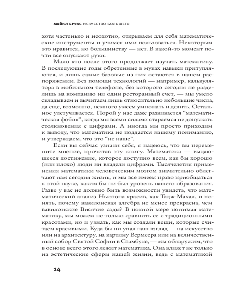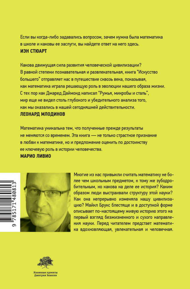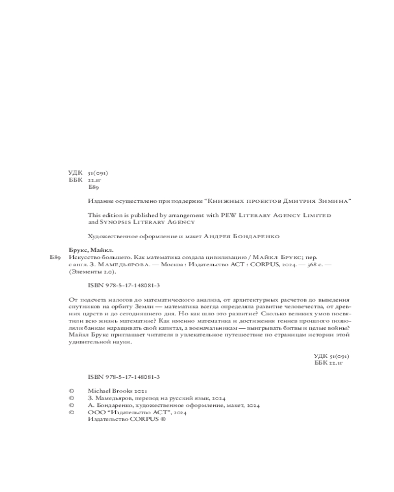 💳 Оплатить за товар можно при получении 🇰🇿 Есть бесплатная доставка по Казахстану от 1 дня 🎁 Копите бонусы с каждой покупки Серия: Элементы 2.0 От подсчета налогов до математического анализа, от архитектурных расчетов до выведения спутников на орбиту Земли — математика всегда определяла развитие человечества, от древних царств и до сегодняшнего дня. Но как шло это развитие? Сколько великих умов посвятили всю жизнь математике? Как именно математика и достижения гениев прошлого позволяли банкам наращивать свой капитал, а военачальникам — выигрывать битвы и целые войны? Майкл Брукс приглашает читателя в увлекательное путешествие по страницам истории этой удивительной науки. |