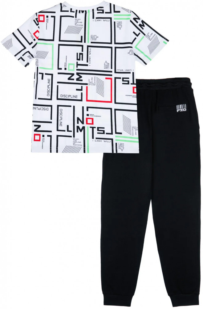 Комплект: футболка, брюки regular fit. Футболка классического прямого силуэта. Высокое содержание хлопка 95%. Благодаря наличию эластана в составе ткани, изделие проще в уходе и держит форму. У брюк функциональные карманы. Эластичный пояс со шнурком.