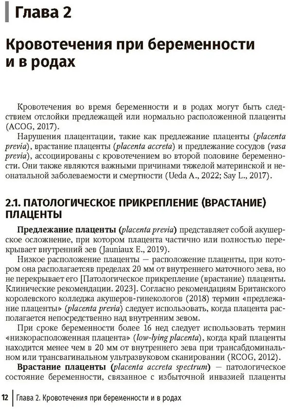 Акушерские кровотечения остаются одной из основных причин материнской заболеваемости и смертности во всех странах мира. Имеются различия в распространенности акушерских кровотечений и связанной с ними смертности в разных странах мира, а также подходах к их управлению. В руководстве проведен анализ клинических рекомендаций различных профессиональных медицинских сообществ (ВОЗ, FIGO, ACOG, RCOG, SCOG, РОАГ) и клинических исследований по проблеме акушерских кровотечений. Изложены современные сведения, касающиеся основных причин, эпидемиологии, классификации кровотечений при беременности, в родах и послеродовом периоде. Даны представления о клинических проявлениях, подходах к диагностике и лечению акушерских кровотечений. Приведены алгоритмы действий медицинского персонала при акушерских кровотечениях, а также возможности профилактики и реабилитации этих пациенток. |