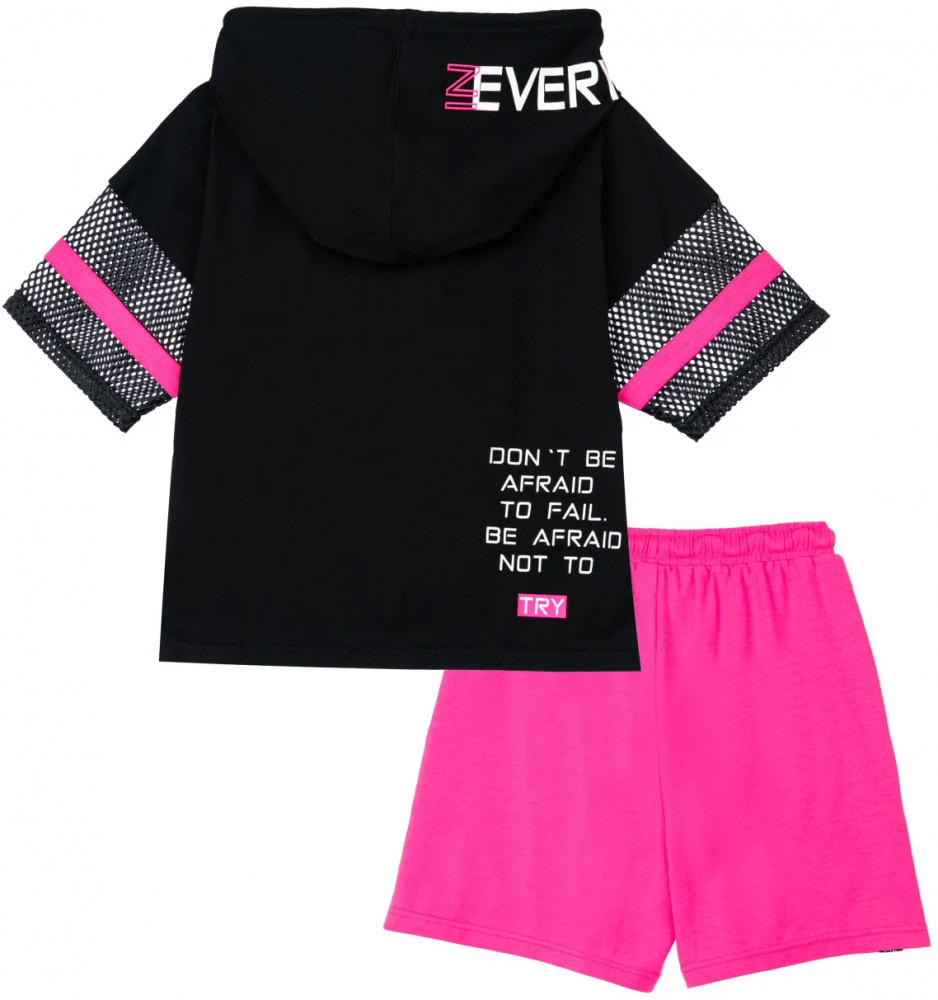Комплект: футболка, шорты из качественного и приятного на ощупь трикотажа джерси. Высокое содержание хлопка. Благодаря наличию эластана в составе ткани изделие проще в уходе и держит форму. Футболка с капюшоном с утяжкой шнурком. Функциональные карманы в боковых швах. Эластичный пояс со шнурком.