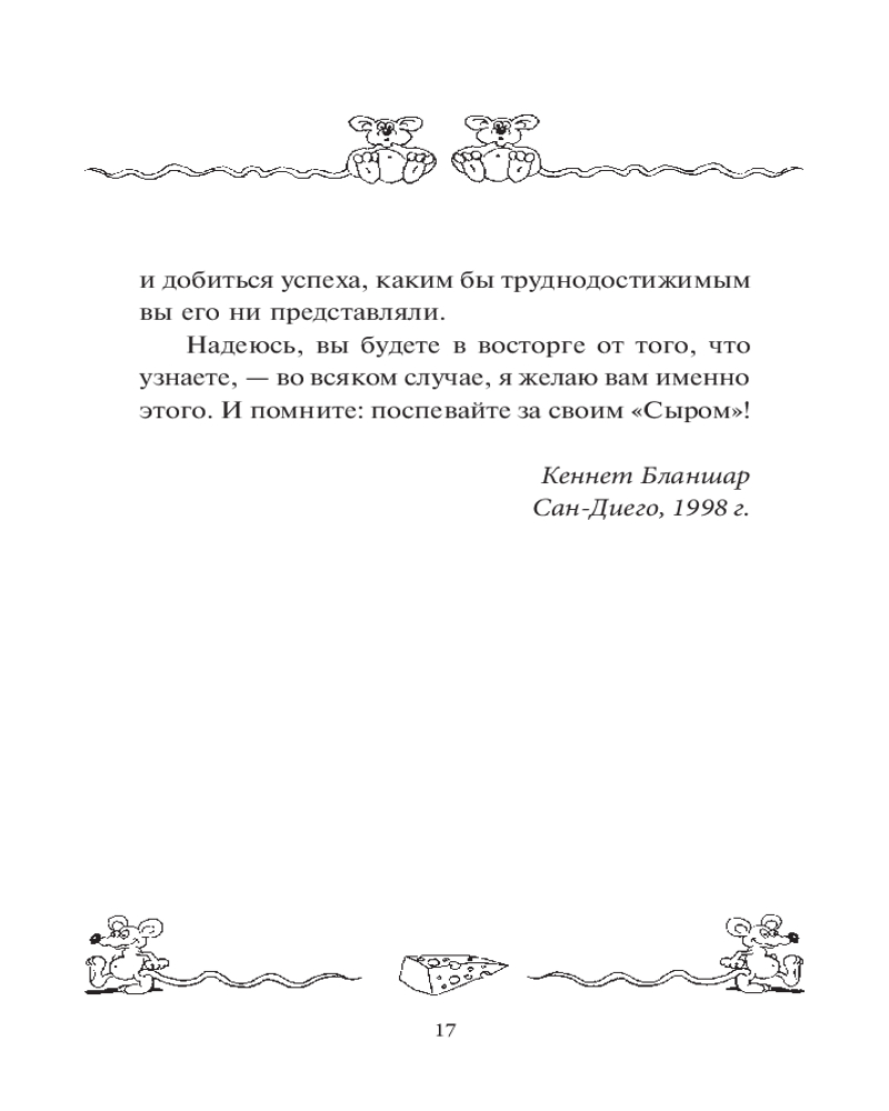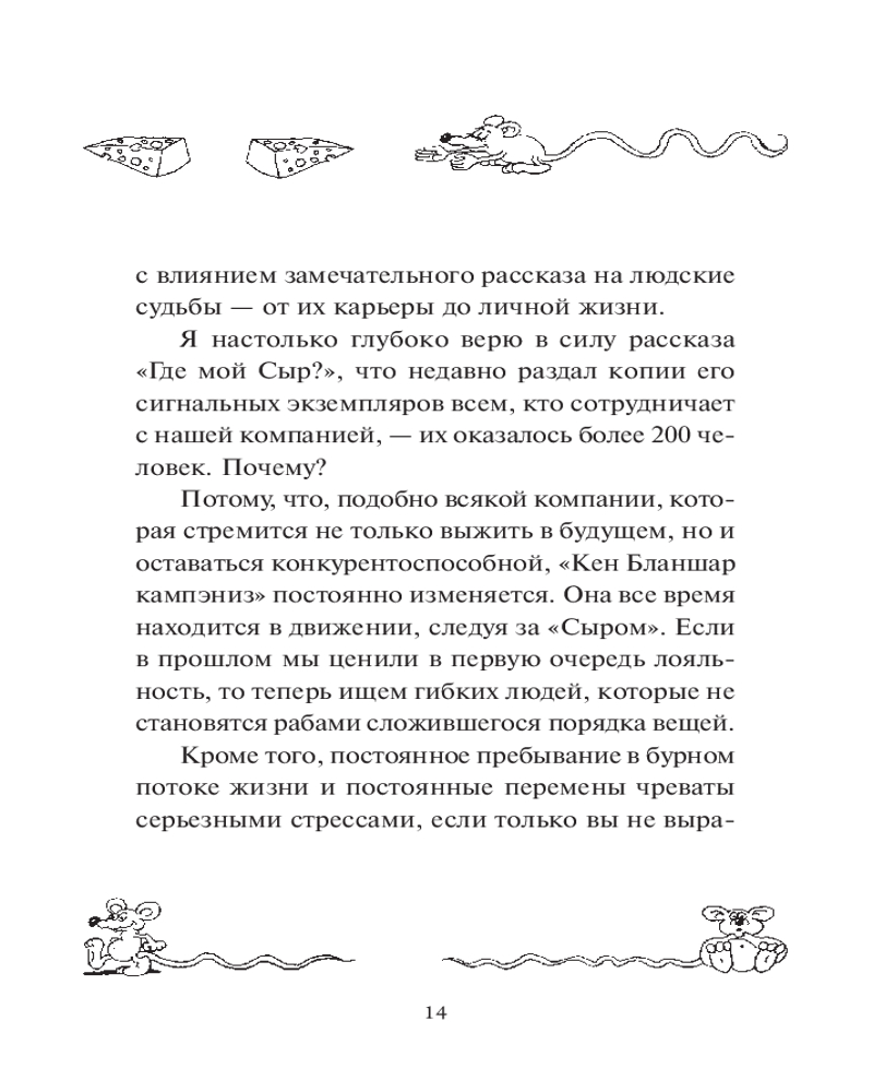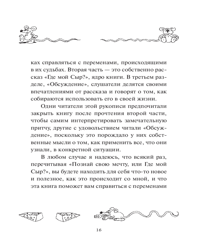 Серия: Психология Если вам наскучила повседневная рутина, если вы стремитесь к переменам и если у вас есть чувство юмора, вам обязательно нужно прочесть эту книгу. «Где мой Сыр?» — это притча о том, как пробираться по запутанным лабиринтам жизни и получать заслуженные награды за свои усилия. Под «Сыром» здесь понимается все, чего человек добивается в жизни, — будь то хорошая работа, любовь, деньги, собственность, здоровье или душевный покой. А «Лабиринт», где вы все это ищете, — организация, в которой вы трудитесь, семья или общество. |