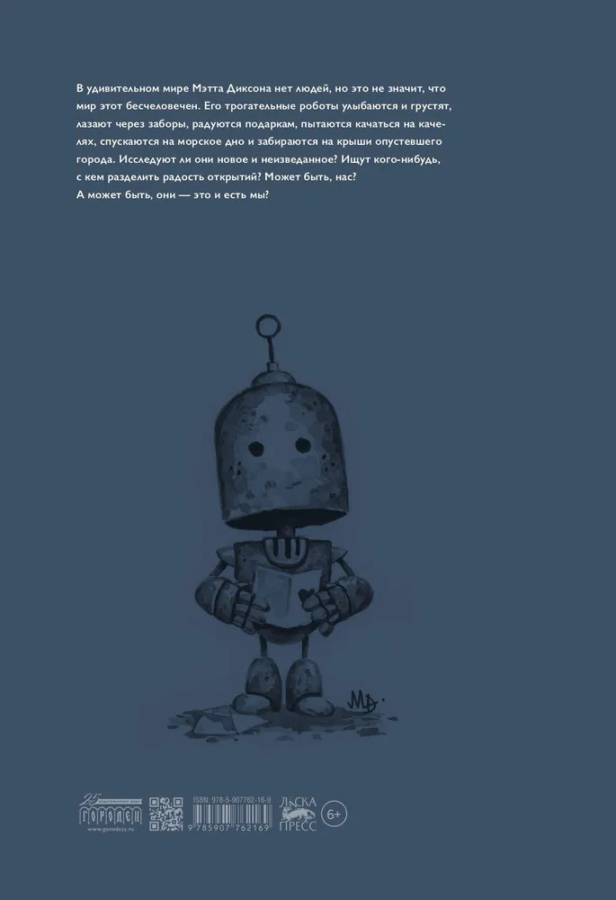 РоботыВ данный момент этот товар отсутствует в продаже. Возможно, у нас найдется аналогичный или похожий товар здесь. Если вам нравятся мыслящие роботы, красочные комиксы и фантастические миры будущего — эта книжка для вас. Если вам нравятся тайны, тонкий юмор, философские сюжеты и персонажи, которым нельзя не сопереживать, — эта книжка для вас.Современный британский цифровой художник Мэтт Диксон создает выразительные истории о приключениях роботов — в них нет слов, но есть и лукавая усмешка, и радость узнавания, и неожиданные вопросы. На которые каждый читатель волен отвечать по-своему. |