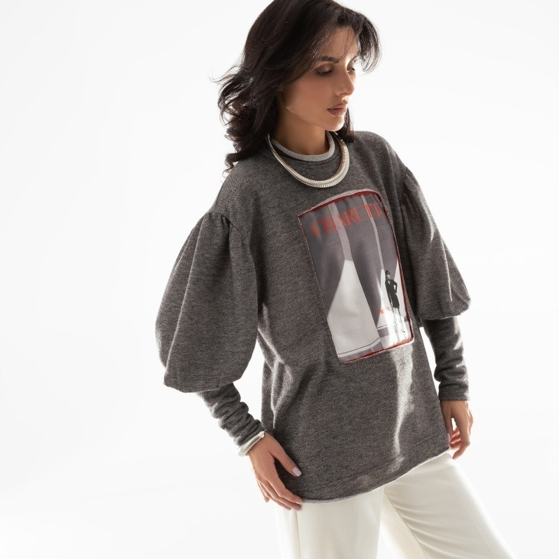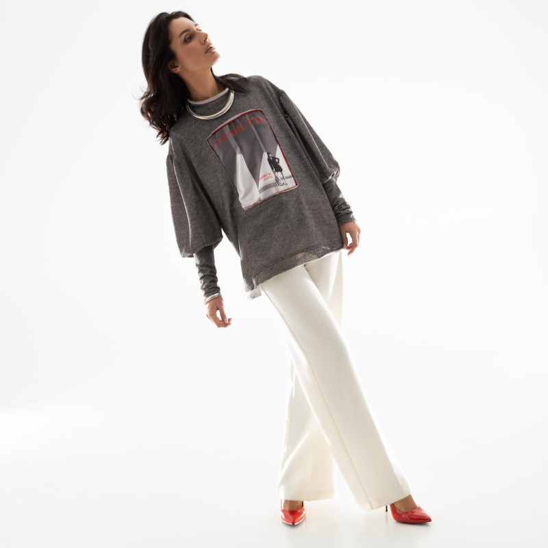 Свитшот классный, оригинальный, для эффекта оверсайз купила 54 на свой 48, но всё равно почему-то рукава узковаты. Закатать рукава, к примеру чтобы руки помыть, не получается, но звезду снимать не стала. С серыми джинсами этого же бренда получился хороший ансамбль.