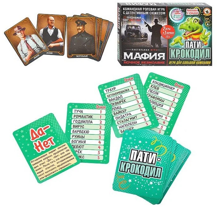 Русский стиль Набор игр настольных 2 в 1 «Мафия. Ночное безмолвие и Пати-крокодил»В данный момент этот товар отсутствует в продаже. Возможно, у нас найдется аналогичный или похожий товар здесь. Этот набор включает в себя две самые популярные игры: «Мафия и Пати-крокодил»! Культовая игра «Мафия» доставит удовольствие и новичкам, и самым искушенным игрокам. Город был захвачен мафией и мирные жители разрабатывают план по спасению. Кто же победит: мафия или мирные граждане? В игре «Пати-крокодил» участники по очереди становятся ведущими и с помощью жестов объясняют другим игрокам слова, написанные на карточках. Попробуй-ка, изобрази жестами Гоблина, Хакера или Вайфай! На каждой карточке написаны 10 слов разной степени сложности. Помимо карточек с вопросами в комплекте две особые карты: «Такой-сякой», вытянув которую нужно описать загаданное слово с помощью определений, и «Да-Нет», вытянув которую команда задает ведущему вопросы, предполагающие ответ «Да!» или «Нет!». Эти две занимательные игры станут любимым развлечением и предоставят возможность всем участникам проявить смекалку, эрудицию и актерские способности! Компактные размеры игры позволят взять ее с собой и весело провести время с друзьями где бы вы не находились. Набор подойдет для компании от 3 до 17 человек.  |