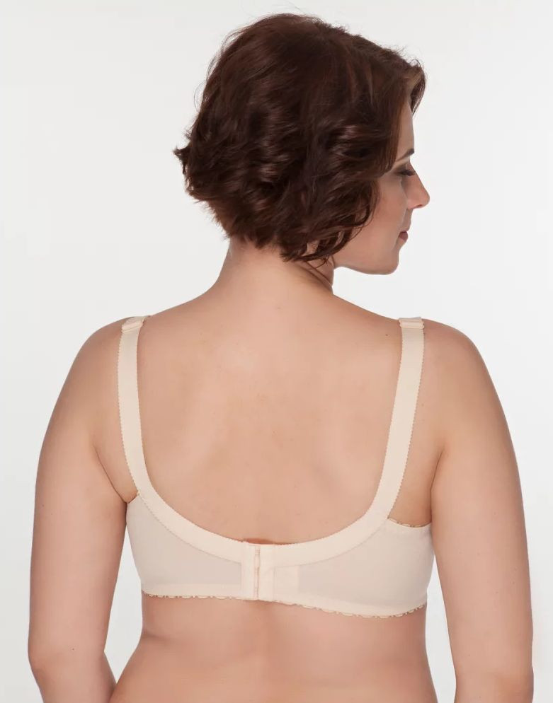 Очень комфортный бюстгальтер для средней и большой груди. Чашки мягкие, без косточек. Выполнен из эластичного и неэластичного трикотажного полотна и неэластичного кружевного полотна. Нижняя деталь чашки на подкладке из неэластичного хлопкового полотна. Хорошо поддерживает и собирает грудь, придает груди красивую форму. Декор — узкое кружево и бантик.