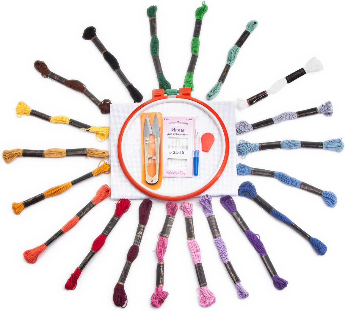 Каждая пасма состоит из 6 отдельных тонких нитей. Благодаря новейшим технологиям мулине Bestex яркие, легкие, равномерные по всей длине. Утолщения и узелки практически не встречаются. Четко выраженная структура нити позволяет использовать мулине для сюжетов со сплошной зашивкой. Вам не придется подбирать иглы и пяльцы, чтобы приступить к вышивке — они уже входят в комплект. Ножницы помогут аккуратно подрезать нить, а вспарыватель — быстро убрать нежелательные стежки. В комплект также входит канва Bestex 14 каунта — она подходит для любой вышивки крестом, от простых детских сюжетов до картин с полной зашивкой и большим количеством цветов.