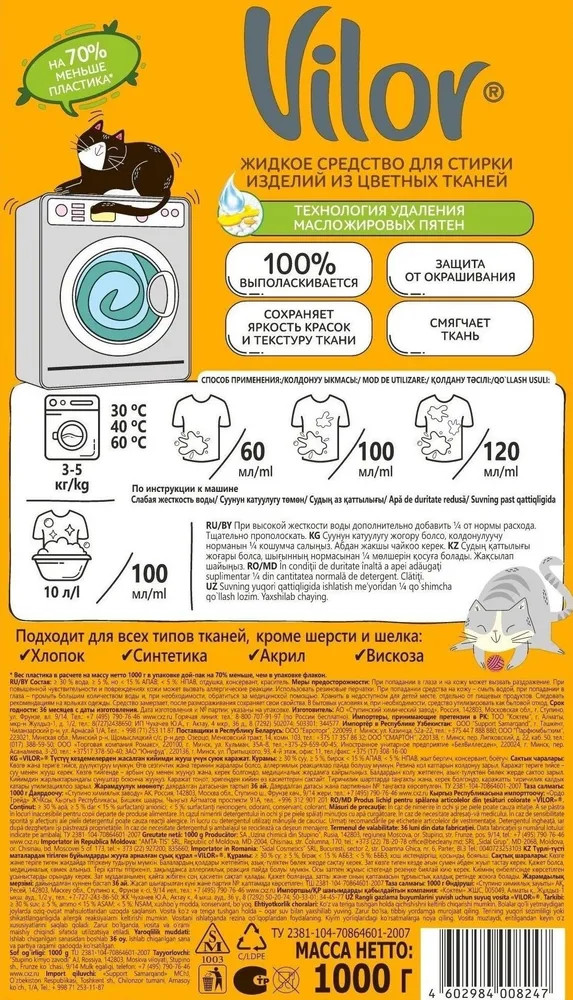 Универсальный гель для стирки белья идеально подходит для эффективной и бережной стирки цветных тканей. Благодаря инновационной формуле и жидкой текстуре, это средство обладает не только очищающими свойствами, но и выполняет функцию смягчения, ароматизации и защиты тканей, обеспечивает полностью безупречный результат, не оставляя следов или разводов на вашей одежде. Вилор является универсальным решением, как для ручной стирки, так и для автоматических стиральных машин (автомат) в воде любой жесткости. Этот уникальный чудо продукт обладает высокой эффективностью и легко справляется с отстирыванием белья (кроме шерсти и шелка). Формула разработана таким образом, чтобы сохранять яркость и насыщенность цвета вашей одежды, 100% выполаскивается из волокон ткани. Он содержит специальные компоненты, которые защищают ткани от загрязнений и сохраняют их красоту и свежесть. Жидкий порошок обеспечивает мягкое и бережное отношение к волокнам, сохраняя структуру и форму и предотвращая их износ и появления катышек, обладает современной технологией удаления масло-жировых пятен.