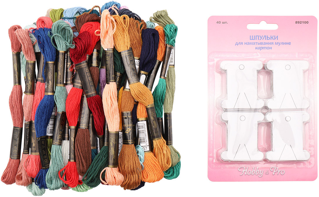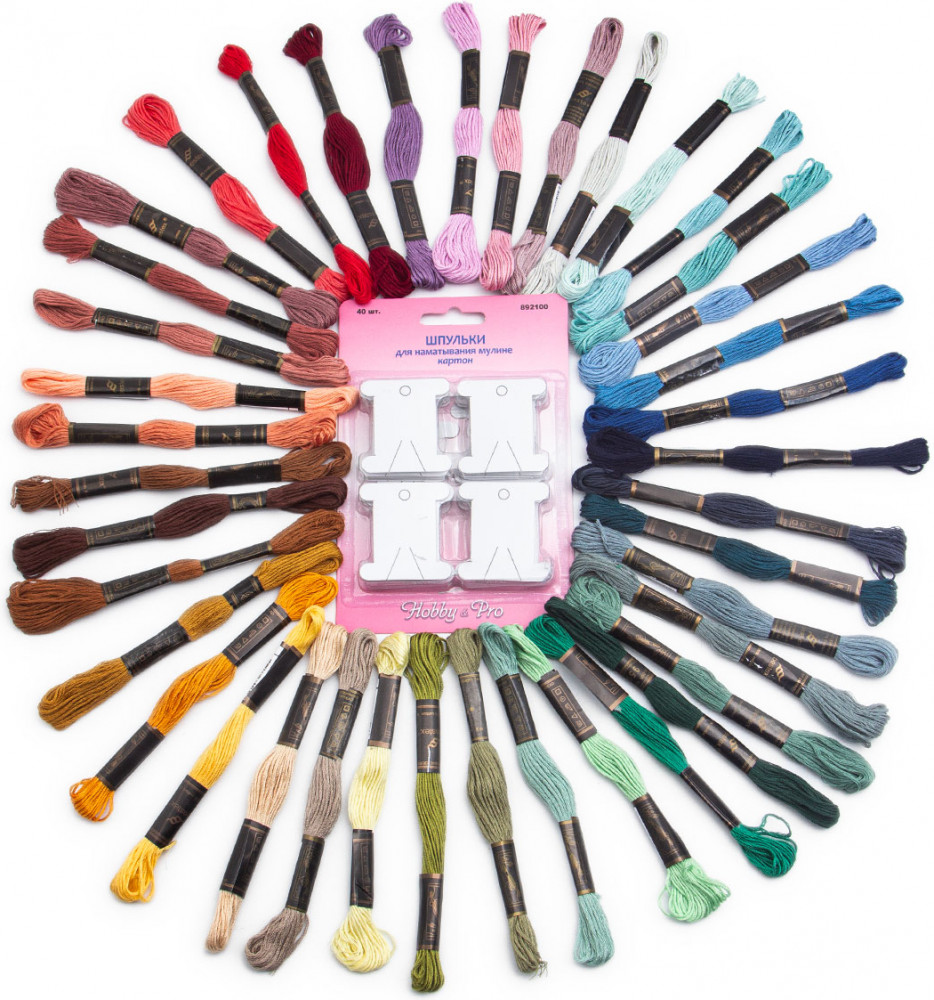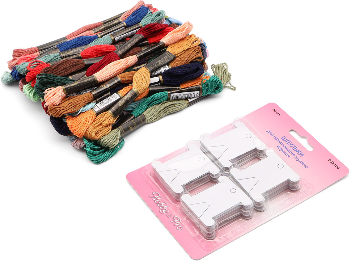 много красивых ниточек мулине, в комплекте картонные бобинки для наматывания мулине