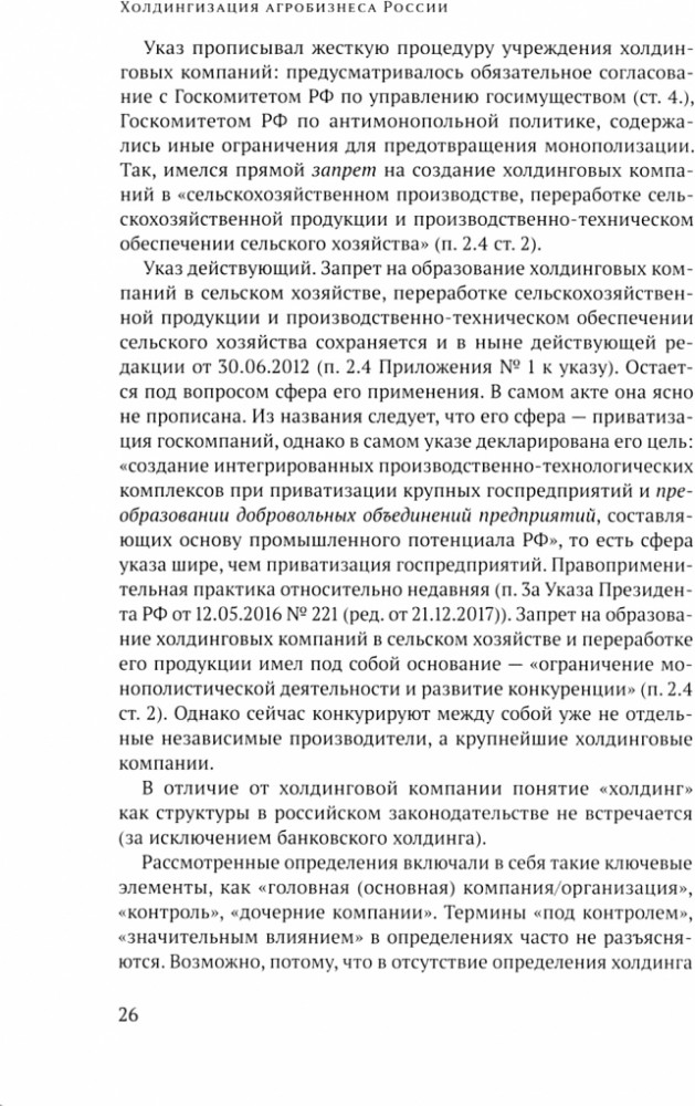 Холдингизация агробизнеса РоссииВ данный момент этот товар отсутствует в продаже. Возможно, у нас найдется аналогичный или похожий товар здесь. В книге рассмотрены теоретические и практические вопросы холдингизации агробизнеса России: дано определение агрохолдинга, его места в системе агробизнеса, проанализированы предпосылки формирования и распространения, предложены методики идентификации и классификации агрохолдингов, оценена их роль в сельском хозяйстве в целом и отдельных его подотраслях, рекомендованы показатели оценки уровня холдингизации и проведена классификация субъектов РФ по степени распространения агрохолдингов. В работе дана оценка сравнительной экономической эффективности использования земли, труда и капитала во входящих и не входящих в агрохолдинги организациях, проанализированы социальные, экологические и эпидемиологические риски крупного бизнеса в сельском хозяйстве, сформулирован ряд рекомендаций, касающихся изменения системы государственной поддержки сельхозпроизводителей, стимулирующей развитие разных форм взаимодействия крупного агробизнеса с малым бизнесом на сельских территориях. |