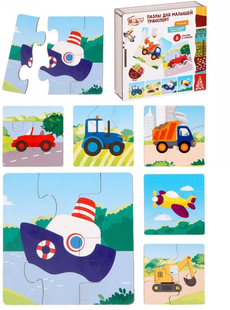 Mapacha Набор пазлов для малышей «Транспорт»В данный момент этот товар отсутствует в продаже. Возможно, у нас найдется аналогичный или похожий товар здесь. Серия: Транспорт Набор пазлов «Транспорт» поможет малышу развить память, логику и наглядно-образное мышление, выучить названия транспорта. Логическая игра направлена на развитие мелкой моторики, терпения и усидчивости. |