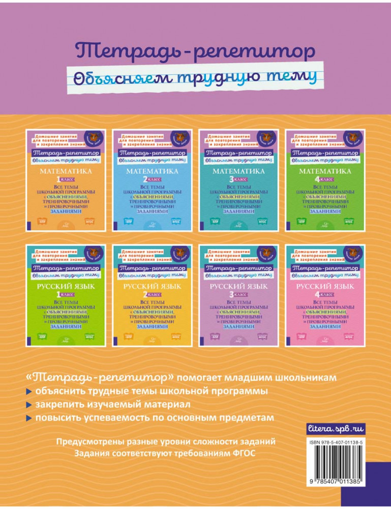 💳 Оплатить за товар можно при получении 🇰🇿 Есть бесплатная доставка по Казахстану от 1 дня 🎁 Копите бонусы с каждой покупки Серия: Тетрадь-репетитор В книге представлены с простыми объяснениями и наглядными примерами самые важные и сложные темы учебной программы для 1 класса. Такими темами являются: состав числа; приёмы сложения и вычитания; сравнение чисел; приёмы решения простых задач на сложение и вычитание и др. В качестве тренировочных упражнений к каждой теме даны задания для самостоятельного выполнения и ответы к ним. В рабочей тетради также есть задания для смекалистых. Книга прекрасно подойдёт для дополнительных домашних занятий с первоклассниками. |
