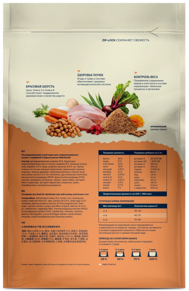 Avance Корм сухой для стерилизованных кошек с индейкой и бурым рисом