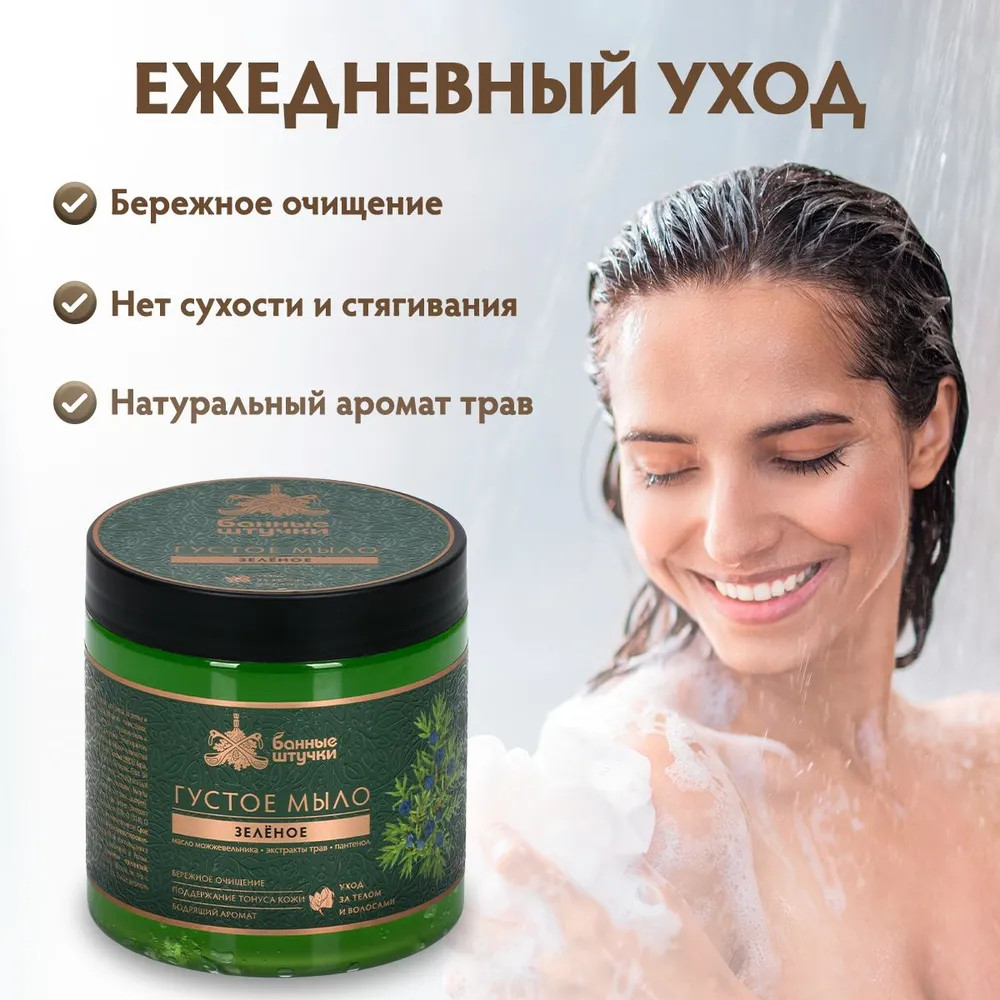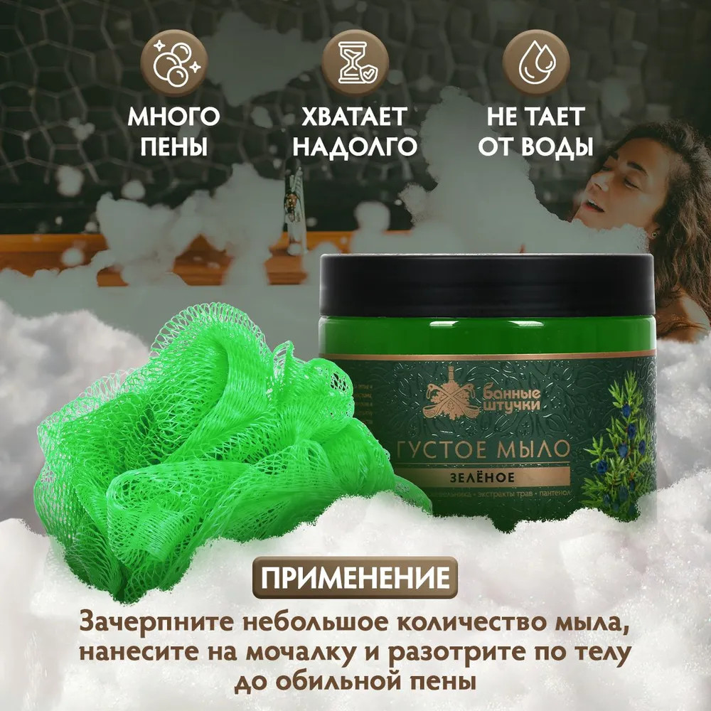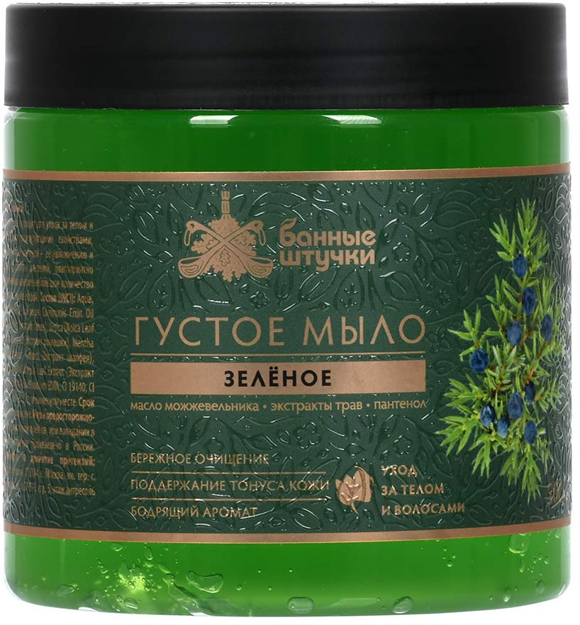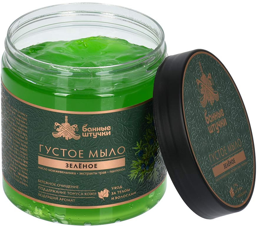 Мыло действительно густое, но не чёрного, а изумрудного зелёного цвета. Приятно пахнет, отличную пену даёт. Мне всё понравилось.