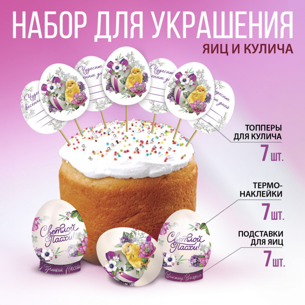 💳 Оплатить за товар можно при получении 🇰🇿 Есть бесплатная доставка по Казахстану от 1 дня 🎁 Копите бонусы с каждой покупки Серия: Пасха С помощью данного набора вы сможете украсить яйца и куличи к светлому празднику Пасхи. В комплект входит 7 термонаклеек, 7 топперов для кулича и 7 подставок для яиц. |