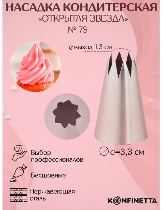 Konfinetta Насадка кондитерская «Открытая звезда»В данный момент этот товар отсутствует в продаже. Возможно, у нас найдется аналогичный или похожий товар здесь. Серия: Открытая звезда Незаменимый инструмент в арсенале каждого кондитера — это качественная насадка. Насадка предназначена для нанесения на десерты необычных украшений из крема. Пользоваться изделием просто: достаточно присоединить его к универсальному кондитерскому мешку. После каждого применения рекомендуется тщательно промывать насадки. Всегда насухо вытирайте насадки после промывания. Рабочий диаметр насадки (выход) — 1,3 см. |