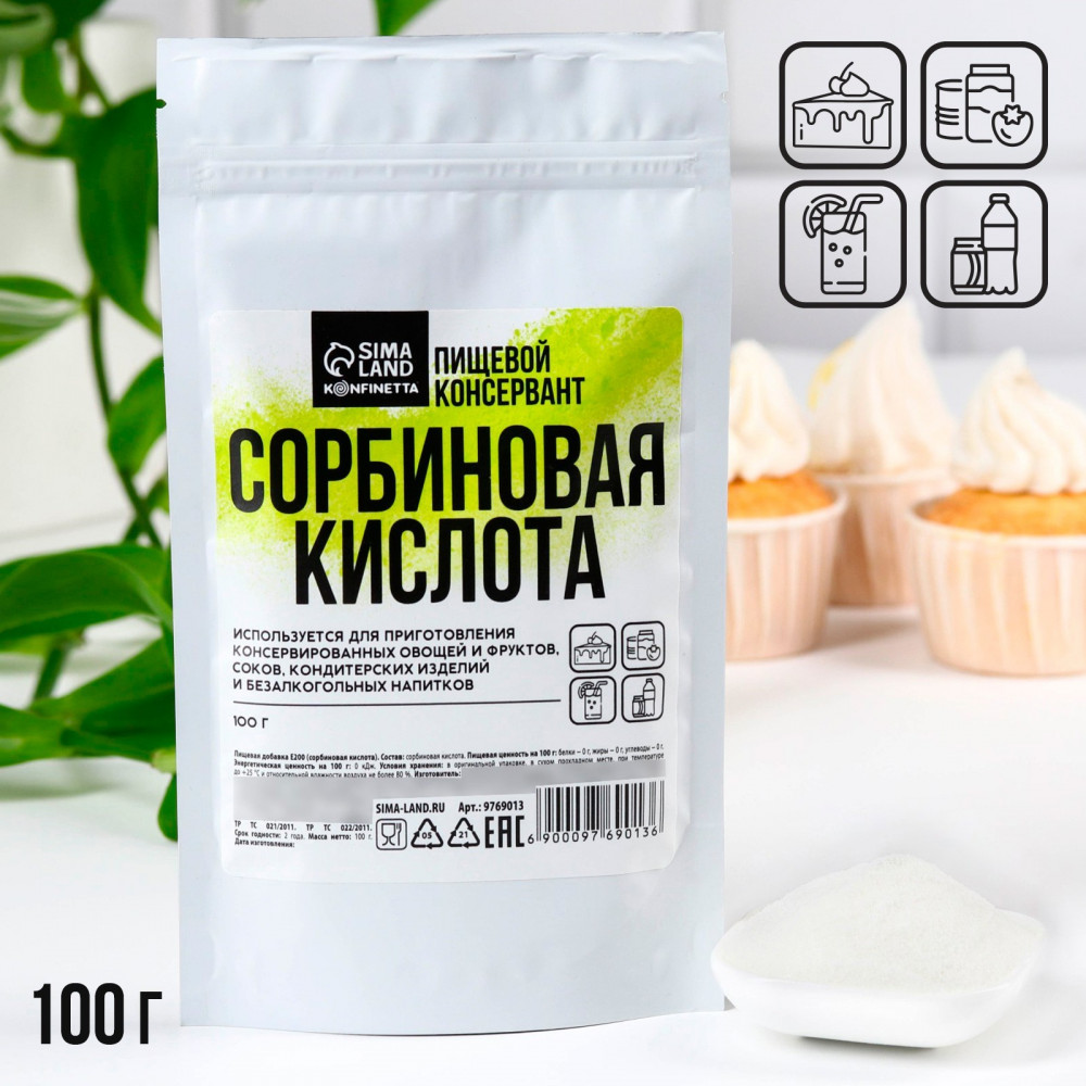 Сорбиновая кислота улучшает качество готового продукта, способствует увеличению сроков хранения. При приготовлении кондитерских изделий сорбиновая кислота добавляется в тесто при замешивании. При приготовлении ягодных начинок, варенья и пюре сорбиновая кислота добавляется на этапе варки, также возможно первоначальное его растворение в малом количестве горячего сиропа. При изготовлении рыбных изделий и рыбных консерв пищевой консервант добавляется во время маринада. При приготовлении овощных маринадов сорбиновая кислота добавляется вместе с уксусной кислотой в рассол. Тем самым овощи остаются хрустящие, а рассол прозрачный.