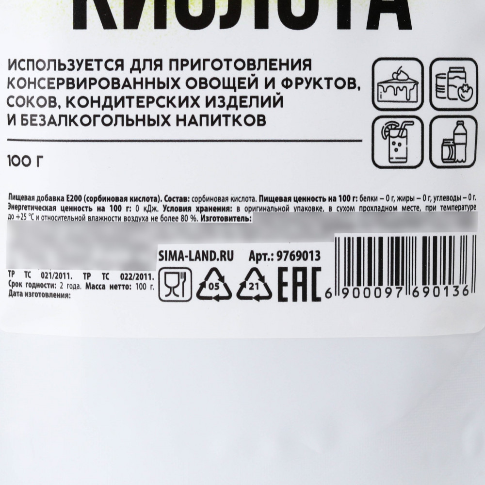 Способ применения: используется для приготовления консервированных овощей и фруктов, соков, кондитерских изделий и безалкогольных напитков.
