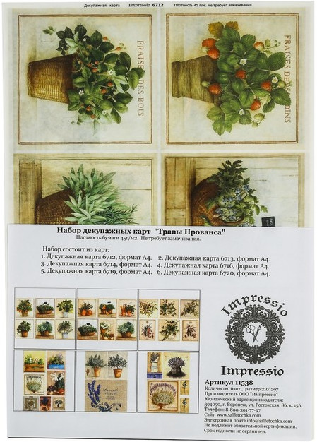 Набор карт декупажных «Травы Прованса»В данный момент этот товар отсутствует в продаже. Возможно, у нас найдется аналогичный или похожий товар здесь. Откройте для себя мир бесконечных возможностей декорирования с качественными декупажными картами из бумаги. Независимо от того, являетесь ли вы начинающим художником или опытным мастером рукоделия, карты помогут вам создать уникальные проекты, которые будут радовать глаз и поднимать настроение. |