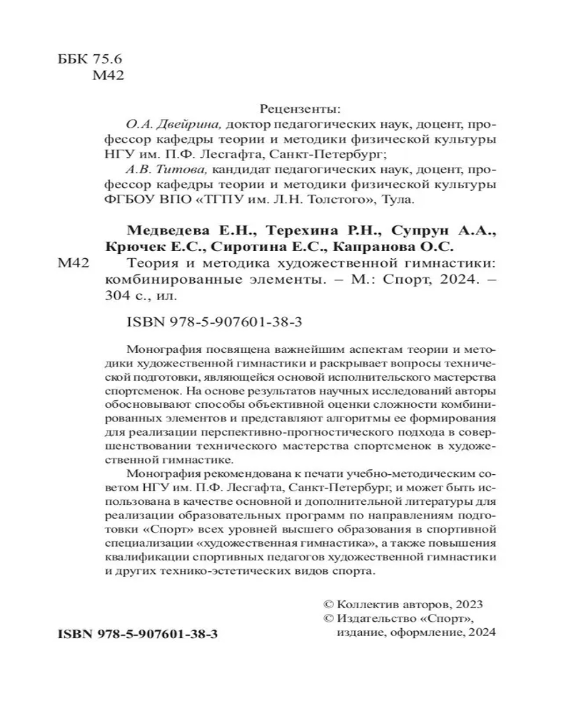 💳 Оплатить за товар можно при получении 🇰🇿 Есть бесплатная доставка по Казахстану от 1 дня 🎁 Копите бонусы с каждой покупки Серия: Библиотечка тренера Монография посвящена важнейшим аспектам теории и методики художественной гимнастики и раскрывает вопросы технической подготовки, являющейся основой исполнительского мастерства спортсменок. На основе результатов научных исследований авторы обосновывают способы объективной оценки сложности комбинированных элементов и представляют алгоритмы ее формирования для реализации перспективно-прогностического подхода в совершенствовании технического мастерства спортсменок в художественной гимнастике. Монография может быть использована в качестве основной и дополнительной литературы для реализации образовательных программ по направлениям подготовки «Спорт» всех уровней высшего образования в спортивной специализации «художественная гимнастика», а также повышения квалификации спортивных педагогов художественной гимнастики и других технико-эстетических видов спорта. |