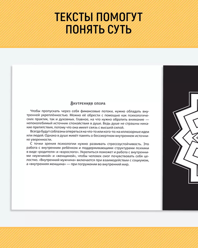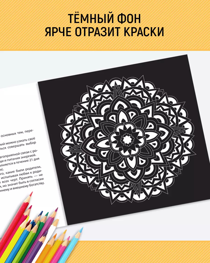 Раскраска-антистресс. Мандалы. Деньгиуспокаивает чёрный фон интересные мандалы В данный момент этот товар отсутствует в продаже. Возможно, у нас найдется аналогичный или похожий товар здесь. Серия: Раскраска-антистресс Раскрашивание мандал — глубокая практика для саморазвития и помощи себе. Настройтесь перед началом, уделив внимание комфортной обстановке. Выберите спокойное место для творчества. Следите за дыханием, чтобы оно было свободным и глубоким. |