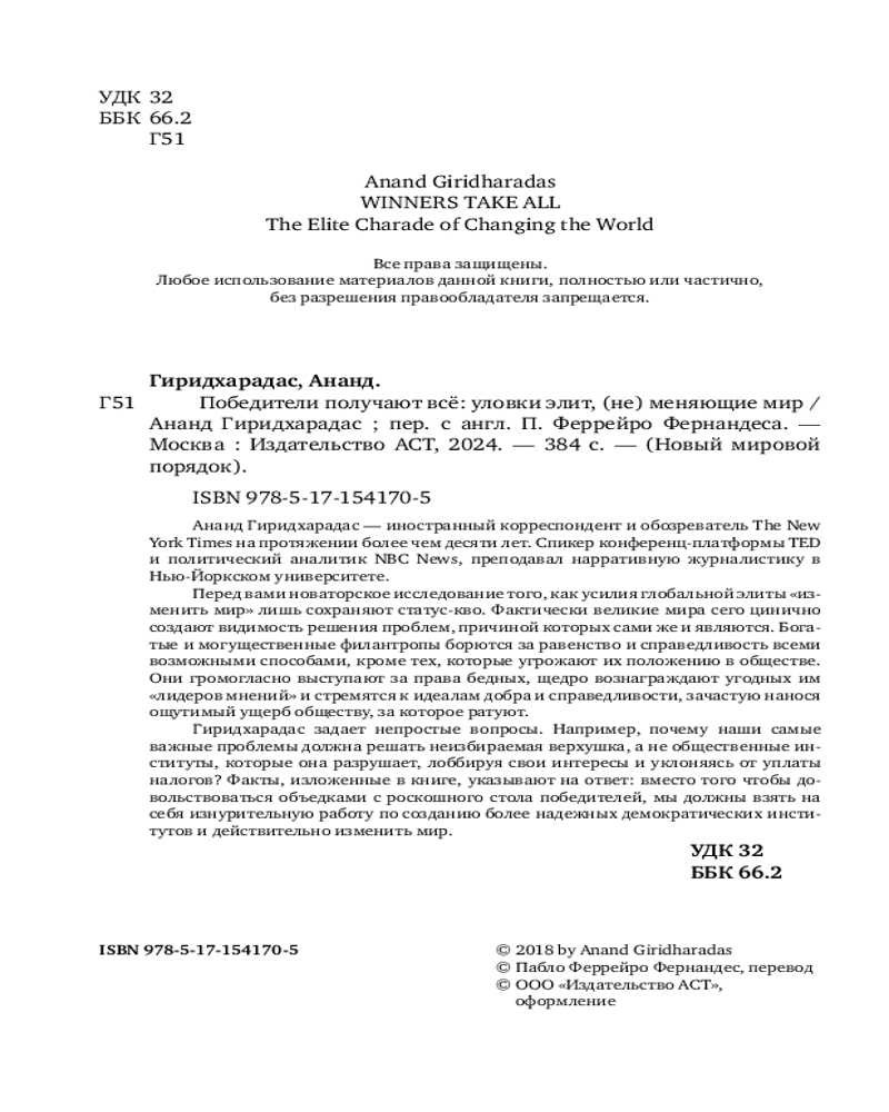 💳 Оплатить за товар можно при получении 🇰🇿 Есть бесплатная доставка по Казахстану от 1 дня 🎁 Копите бонусы с каждой покупки Серия: Новый мировой порядок Ананд Гиридхарадас — иностранный корреспондент и обозреватель The New York Times на протяжении более чем десяти лет. Спикер конференц-платформы TED и политический аналитик NBC News, преподавал нарративную журналистику в Нью-Йоркском университете. |