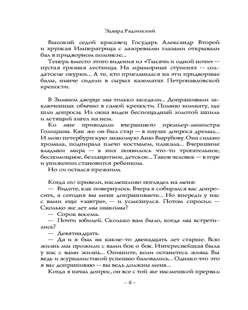 💳 Оплатить за товар можно при получении 🇰🇿 Есть бесплатная доставка по Казахстану от 1 дня 🎁 Копите бонусы с каждой покупки Серия: Бестселлеры Эдварда Радзинского Мираж императорского Петербурга, роскошь романовских дворцов... и печальный Петербург Достоевского, убогие квартиры террористов, где эти кровавые идеалисты готовили будущее Родины, — таковы главные места действия книги. Герои повествования — император Александр II, последний великий царь и первый донжуан Европы, педантично описавший в секретном дневнике пять покушений на собственную жизнь и свою последнюю безумную любовь, и князь В-кий, потомок знаменитого рода Рюриковичей... секретный агент тайной полиции. Его глазами мы увидим властителей дум эпохи — Достоевского и Герцена, Бакунина и Маркса. И наших знаменитых молодых революционеров, создавших самую мощную террористическую организацию Европы. |