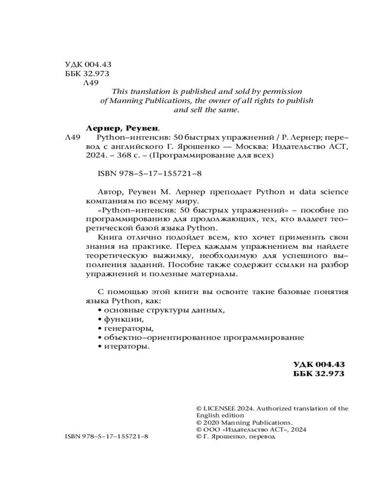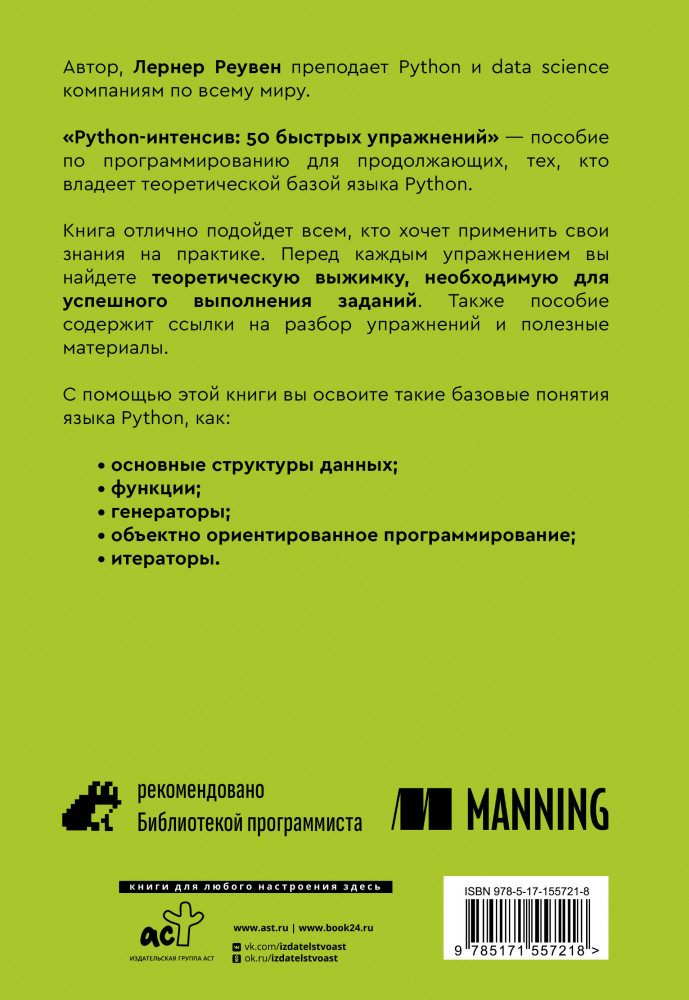 💳 Оплатить за товар можно при получении 🇰🇿 Есть бесплатная доставка по Казахстану от 1 дня 🎁 Копите бонусы с каждой покупки Серия: Программирование для всех Автор, Реувен Лернер преподает Python и data science компаниям по всему миру. «Python-интенсив: 50 быстрых упражнений» — пособие по программированию для продолжающих, тех, кто владеет теоретической базой языка Python. Книга отлично подойдет всем, кто хочет применить свои знания на практике. Перед каждым упражнением вы найдете теоретическую выжимку, необходимую для успешного выполнения заданий. Пособие также содержит ссылки на разбор упражнений и полезные материалы. |