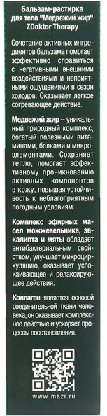 ZDoktor Бальзам-растирка для тела «Медвежий жир»В данный момент этот товар отсутствует в продаже. Возможно, у нас найдется аналогичный или похожий товар здесь. Медвежий жир — уникальный природный комплекс, богатый полезными витаминами, белками и микроэлементами. Сохраняет тепло, помогает эффективному проникновению активных компонентов в кожу, повышая устойчивость к неблагоприятным погодным условиям. Комплекс эфирных масел можжевельника, эвкалипта, мяты обладает антибактериальным свойством, улучшает микроциркуляцию, оказывает успокаивающее и релаксирующее действие. Коллаген является основой соединительной ткани человека, он оказывает комплексное действие и ускоряет процессы восстановления. |