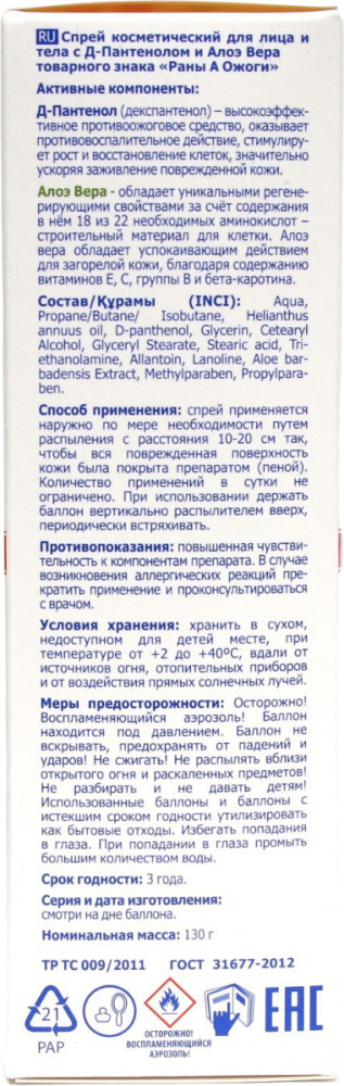 Раны А Ожоги Спрей косметический для лица и тела «Пантенол. Алоэ Вера»В данный момент этот товар отсутствует в продаже. Возможно, у нас найдется аналогичный или похожий товар здесь. Д-Пантенол (декспантенол) — высокоэффективное противоожоговое средство, оказывает противовоспалительное действие, стимулирует рост и восстановление клеток, значительно ускоряя заживление поврежденной кожи. |