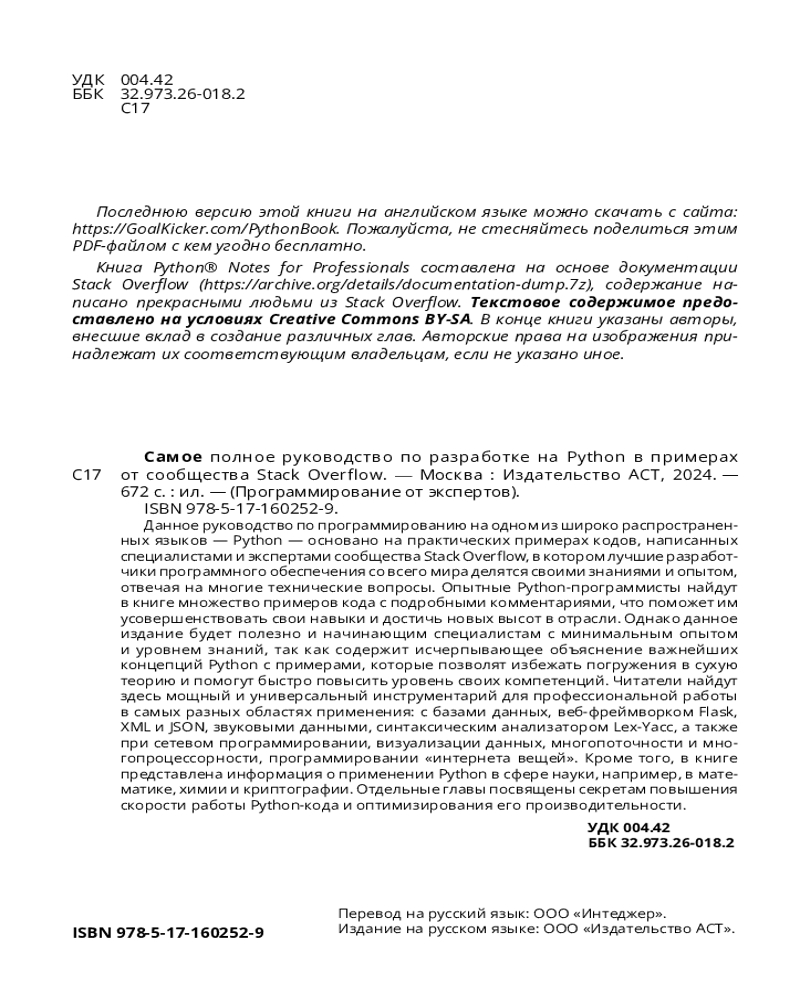 Серия: Программирование от экспертов Данное руководство по программированию на одном из широко распространенных языков — Python — основано на практических примерах кодов, написанных специалистами и экспертами сообщества Stack Overflow, в котором лучшие разработчики программного обеспечения со всего мира делятся своими знаниями и опытом, отвечая на многие технические вопросы.
