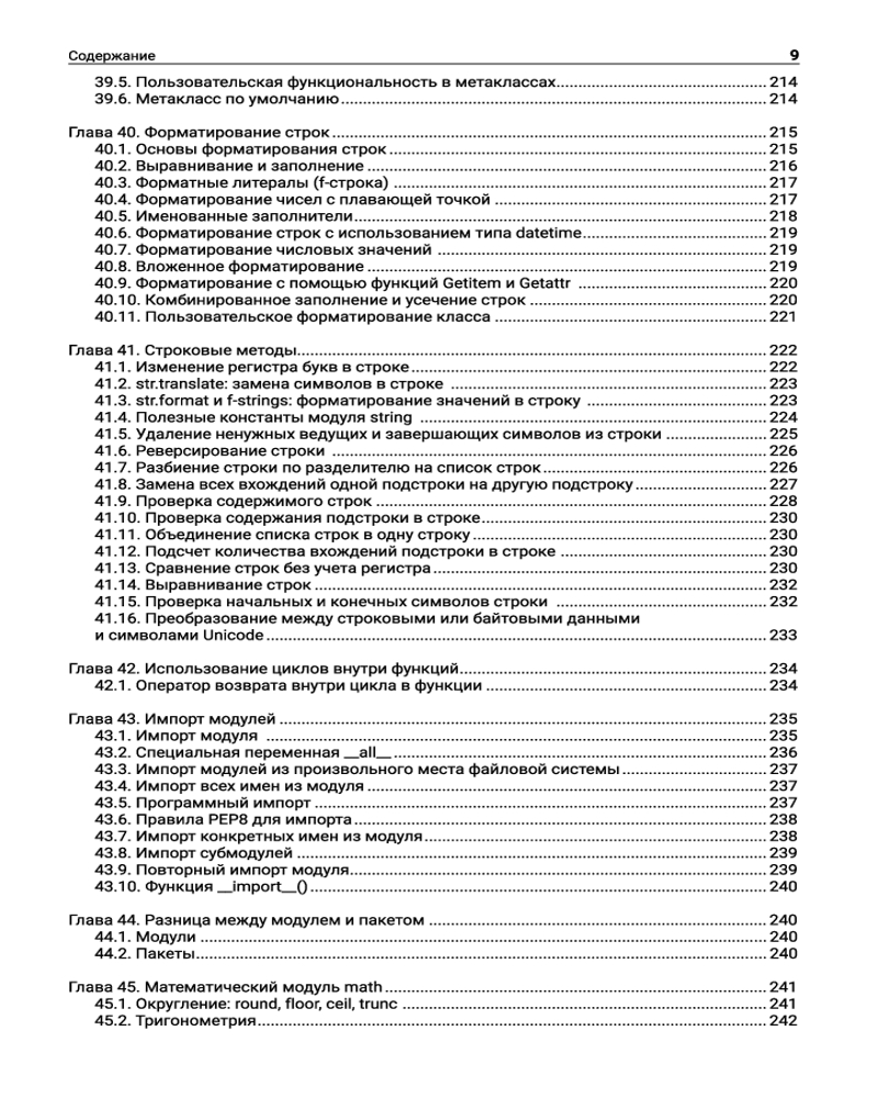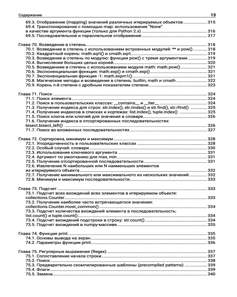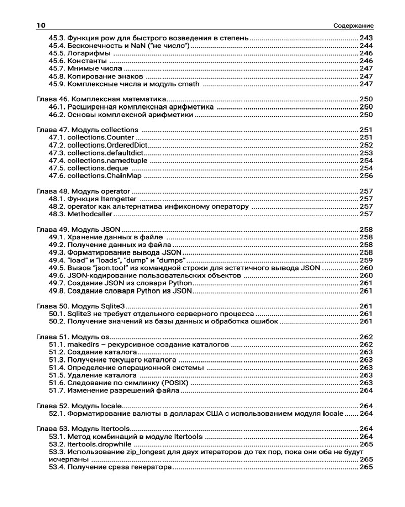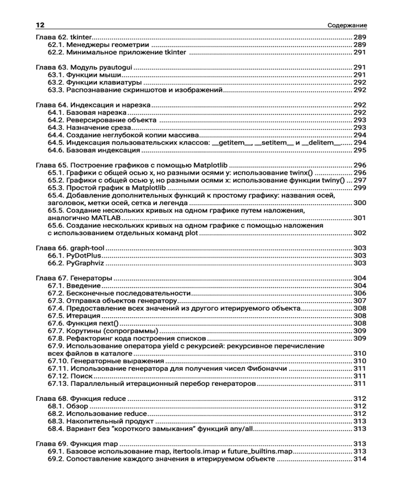 Читатели найдут здесь мощный и универсальный инструментарий для профессиональной работы в самых разных областях применения: с базами данных, веб-фреймворком Flask, XML и JSON, звуковыми данными, синтаксическим анализатором Lex-Yacc, а также при сетевом программировании, визуализации данных, многопоточности и многопроцессорности, программировании «интернета вещей». Кроме того, в книге представлена информация о применении Python в сфере науки, например, в математике, химии и криптографии. Отдельные главы посвящены секретам повышения скорости работы Python-кода и оптимизирования его производительности. |