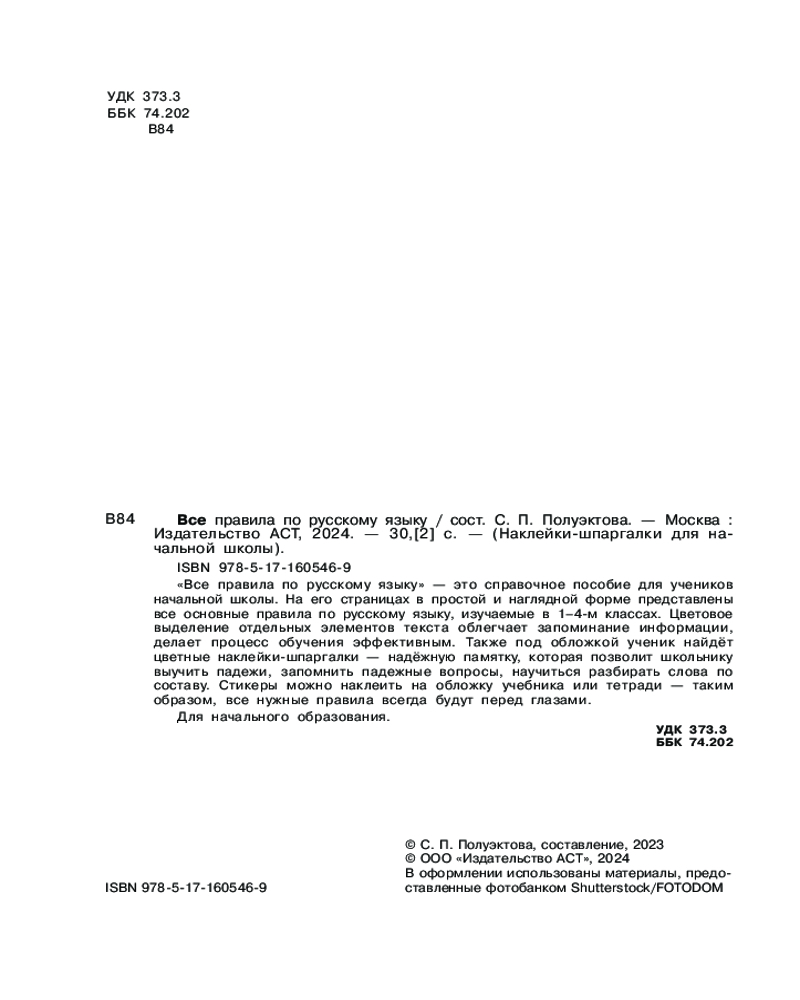 💳 Оплатить за товар можно при получении 🇰🇿 Есть бесплатная доставка по Казахстану от 1 дня 🎁 Копите бонусы с каждой покупки Серия: Наклейки-шпаргалки для начальной школы «Все правила по русскому языку» — это справочное пособие для учеников начальной школы. На его страницах в простой и наглядной форме представлены все основные правила по русскому языку, изучаемые в 1−4 классах. Цветовое выделение отдельных элементов текста облегчает запоминание информации, делает процесс обучения эффективным. Также под обложкой ученик найдёт цветные наклейки-шпаргалки — надёжную памятку, которая позволит школьнику легко освоить алфавит, выучить падежи, запомнить падежные вопросы, научиться определять главные и второстепенные члены предложения. Стикеры можно наклеить на обложку учебника или тетради — таким образом, все нужные правила всегда будут перед глазами. Для начального образования. |