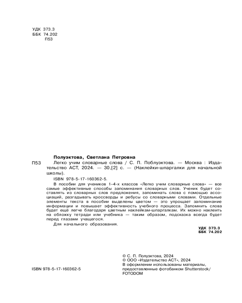 💳 Оплатить за товар можно при получении 🇰🇿 Есть бесплатная доставка по Казахстану от 1 дня 🎁 Копите бонусы с каждой покупки Серия: Наклейки-шпаргалки для начальной школы В пособии для учеников 1−4 классов «Легко учим словарные слова» — все самые эффективные способы запоминания словарных слов. Ученик будет составлять из словарных слов предложения, запоминать слова с помощью ассоциаций, разгадывать кроссворды и ребусы со словарными словами. Отдельные элементы текста в пособии выделены цветом — это упрощает запоминание информации и повышает эффективность учебного процесса. Запомнить слова будет ещё легче благодаря цветным наклейкам-шпаргалкам. Их можно наклеить на обложку тетради или учебника — таким образом, подсказки всегда будет перед глазами учащегося. Для начального образования. |