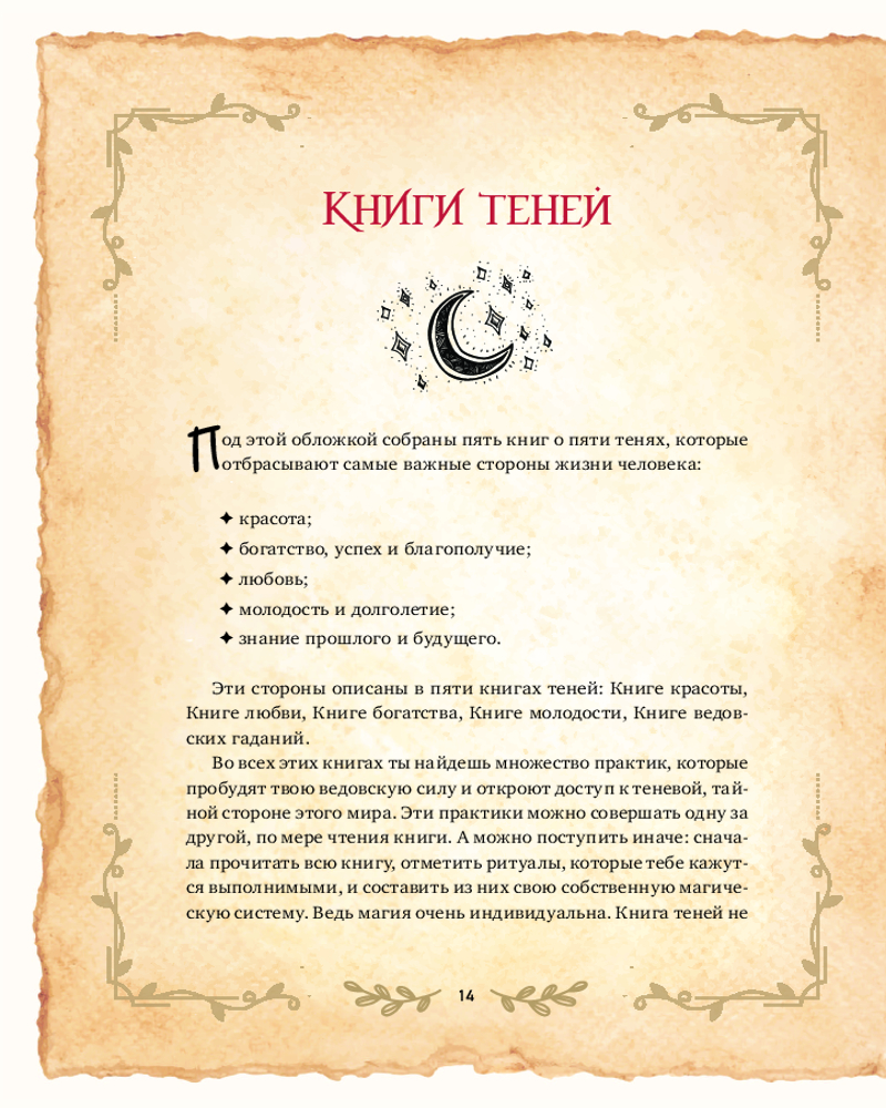 В твоих руках настоящий гримуар, созданный ведьмой-практиком. Под его обложкой собраны пять книг о пяти тенях, которые отбрасывают самые важные стороны нашей жизни: красота, любовь, богатство, долголетие, знание прошлого и будущего. В каждой книге ты найдешь ритуалы, заклинания и рецепты зелий, посвященные одной из тем. Используй их в своей колдовской практике, чтобы развить внутренние способности. Научись направлять энергию на исполнение желаний — на то, чтобы стать счастливой, привлекательной и успешной. Яркая обложка и цветное издание сделают книгу идеальным подарком для опытных и начинающих ведьм, а также для тех, кто хочет добавить немного магии в свою повседневную жизнь. |