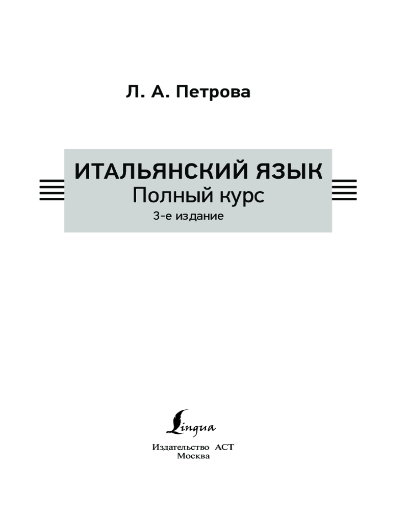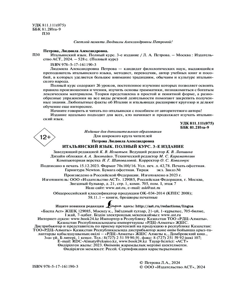💳 Оплатить за товар можно при получении 🇰🇿 Есть бесплатная доставка по Казахстану от 1 дня 🎁 Копите бонусы с каждой покупки Серия: ПолныйКурс Людмила Александровна Петрова — кандидат филологических наук, выдающийся преподаватель итальянского языка, методист, переводчик, автор учебных книг и пособий, в которых уделяется большое внимание традициям, обычаям и культуре итальянского народа. Полный курс содержит 26 уроков, постепенное изучение которых позволяет освоить правила произношения и чтения, изучить основы грамматики, познакомиться с богатым лексическим материалом. Теория представлена в простой и понятной форме, а разнообразные упражнения на все виды речевой деятельности помогают закрепить полученные знания. Любопытные факты об Италии и итальянцах расширяют кругозор и делают обучение еще интереснее. |