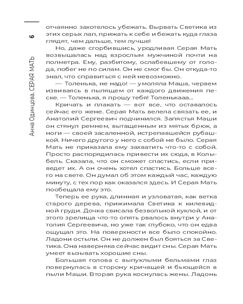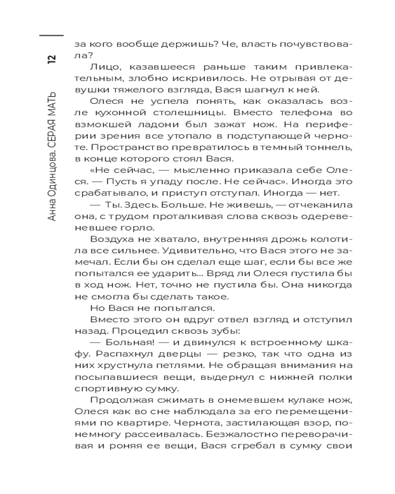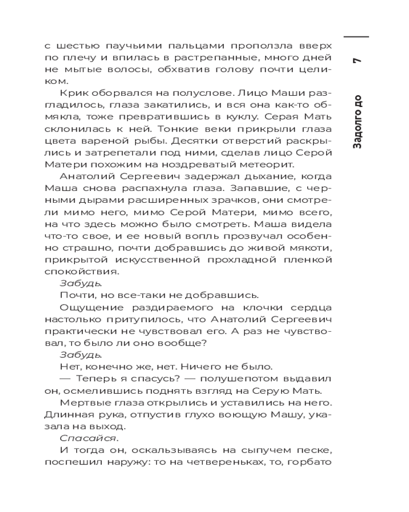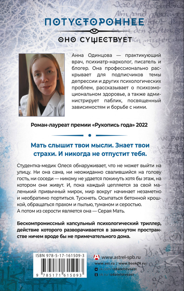 Серия: Потустороннее Мать слышит твои мысли. Знает твои страхи. И никогда не отпустит тебя. Студентка-медик Олеся обнаруживает, что не может выйти на улицу. Ни она сама, ни неожиданно свалившийся на голову гость, ни соседи — никому не удается покинуть хотя бы этаж, на котором они живут. И, пока каждый цепляется за свой маленький привычный мирок, мир вокруг начинает незаметно и необратимо портиться. Тускнеть. Осыпаться бетонной крошкой, обращаться прахом и пылью, туманом и серостью. |