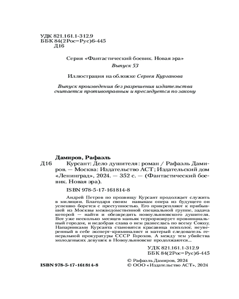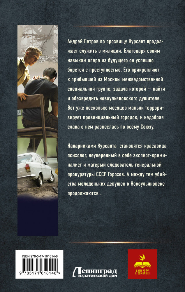 Серия: Фантастический боевик. Новая эра Андрей Петров по прозвищу Курсант продолжает служить в милиции. Благодаря своим навыкам опера из будущего он успешно борется с преступностью. Его прикрепляют к прибывшей из Москвы межведомственной специальной группе, задача которой — найти и обезвредить новоульяновского душителя. Вот уже несколько месяцев маньяк терроризирует провинциальный городок, и недобрая слава о нем разнеслась по всему Союзу. Напарниками Курсанта становятся красавица психолог, неуверенный в себе эксперт-криминалист и матерый следователь генеральной прокуратуры СССР Горохов. А между тем убийства молоденьких девушек в Новоульяновске продолжаются... |