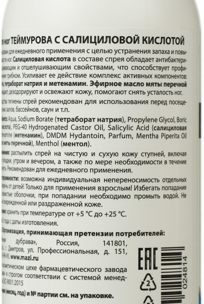 💳 Оплатить за товар можно при получении 🇰🇿 Есть бесплатная доставка по Казахстану от 1 дня 🎁 Копите бонусы с каждой покупки Спрей для ног «Теймурова» с салициловой кислотой — отличное решение для заботы о ваших ножках. Благодаря антибактериальным компонентам, средство эффективно устраняет избыточную потливость ног и препятствует появлению неприятного запаха. Перечная мята и ментол оказывают охлаждающий и дезодорирующий эффект. Рекомендован для использования в качестве средства гигиены перед посещение спортзалов, саун и так далее. |