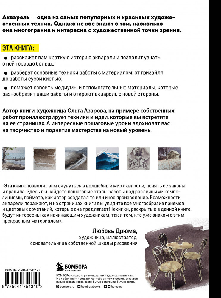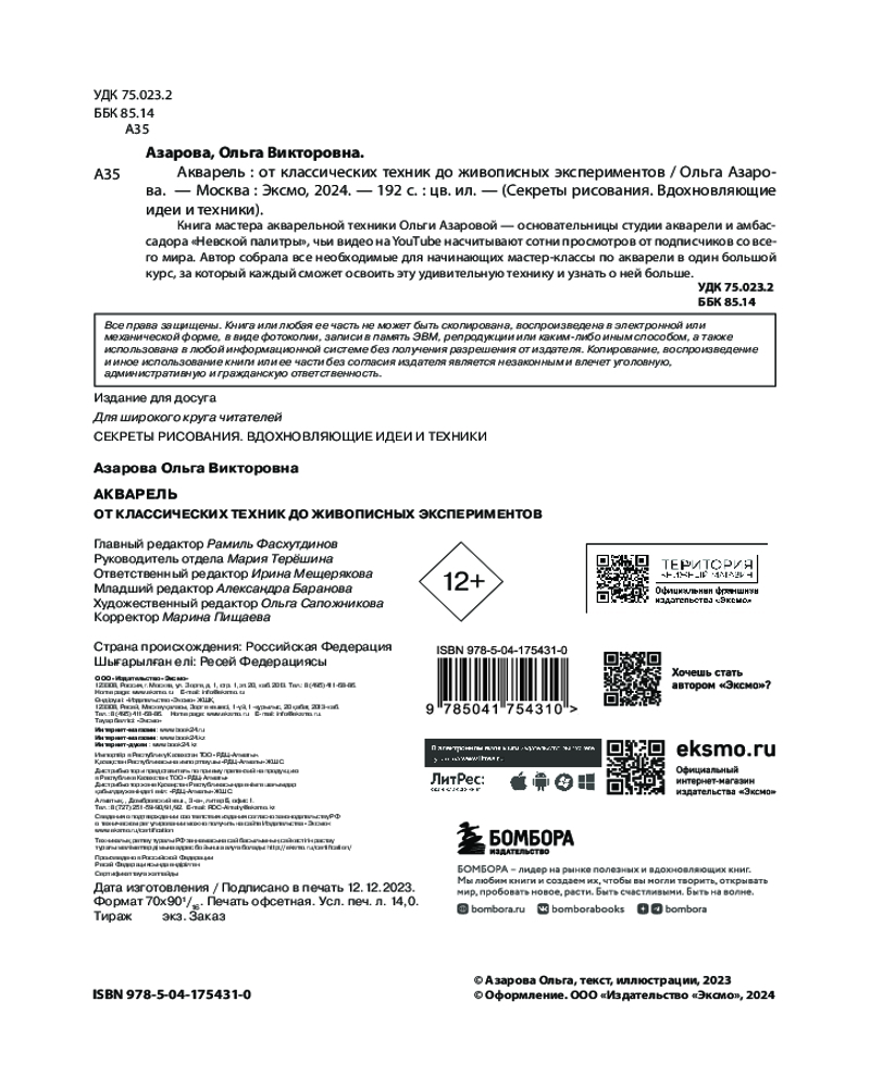 Автор книги — Ольга Азарова, профессиональная художница и мастер акварельной техники. Ольга — основательница собственной студии акварели и амбассадор «Невской палитры», чьи видео на YouTube набирают сотни просмотров от подписчиков со всего мира. |