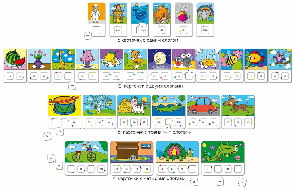 💳 Оплатить за товар можно при получении 🇰🇿 Есть бесплатная доставка по Казахстану от 1 дня 🎁 Копите бонусы с каждой покупки Развивающая игра «Слоги» поможет ребёнку научиться составлять слова. На каждой карточке нарисован предмет с изображением слова, к которому нужно правильно подобрать слоги. В игре предусмотрена система самопроверки: если фишки-слоги вставлены в окошки под картинкой верно, то цветные половинки сойдутся. |