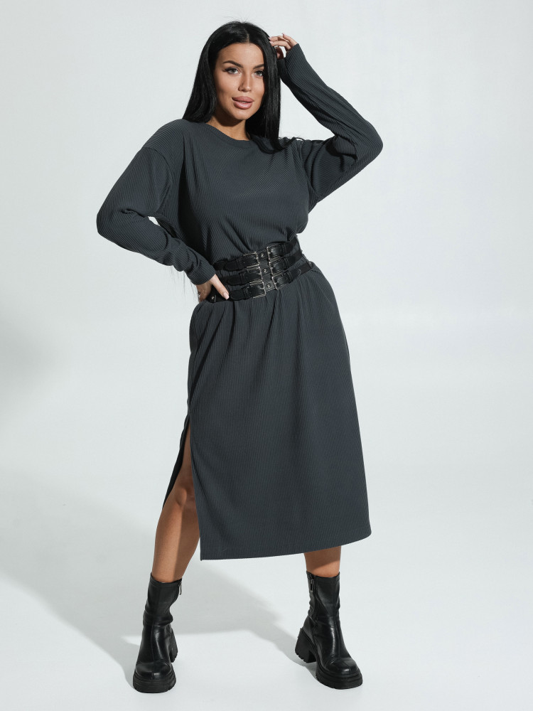 Платье, цвет серый, размер 54/56, размеру соответствует, сшито аккуратно, строчки ровные, ниток торчащих нет.