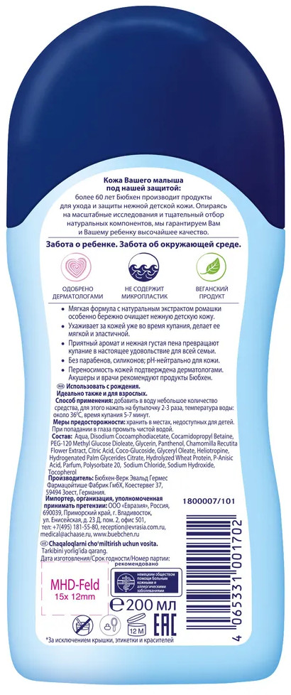 💳 Оплатить за товар можно при получении 🇰🇿 Есть бесплатная доставка по Казахстану от 1 дня 🎁 Копите бонусы с каждой покупки Сливочно-кремовая пена и успокаивающий аромат ромашки доставят полноценное удовольствие от принятия ванны. Мягкая формула с экстрактом ромашки очищает, успокаивает и питает нежную кожу ребенка уже во время купания. Средство поддерживает естественный защитный барьер кожи, а сама кожа остается мягкой и эластичной даже после ежедневного купания. Формула разработана с целью снижения риска аллергических реакций. |